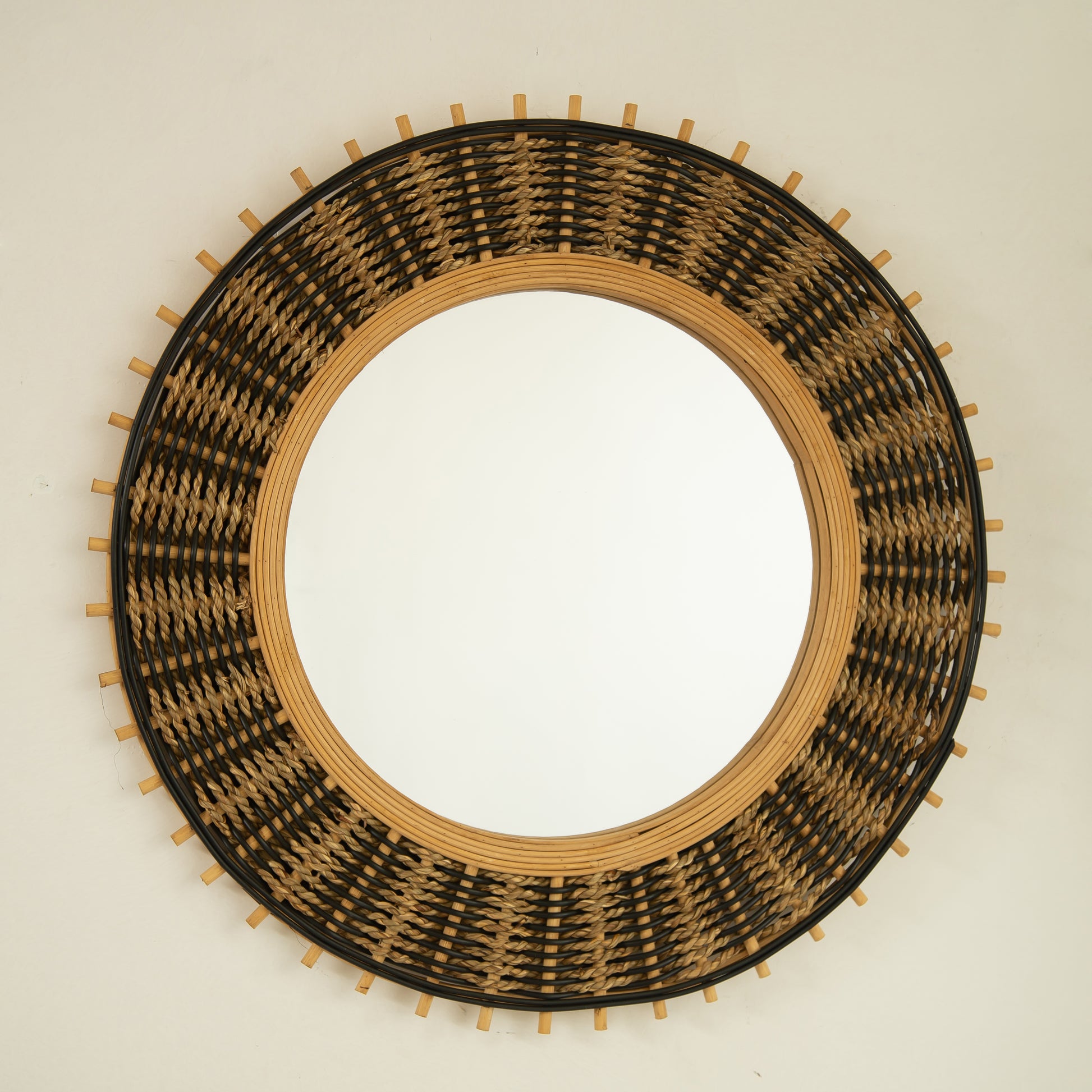 - Meticulously wrapped in light yellow and black hemp ropes, the mirror showcases artisan craftsmanship through its orderly woven pattern.