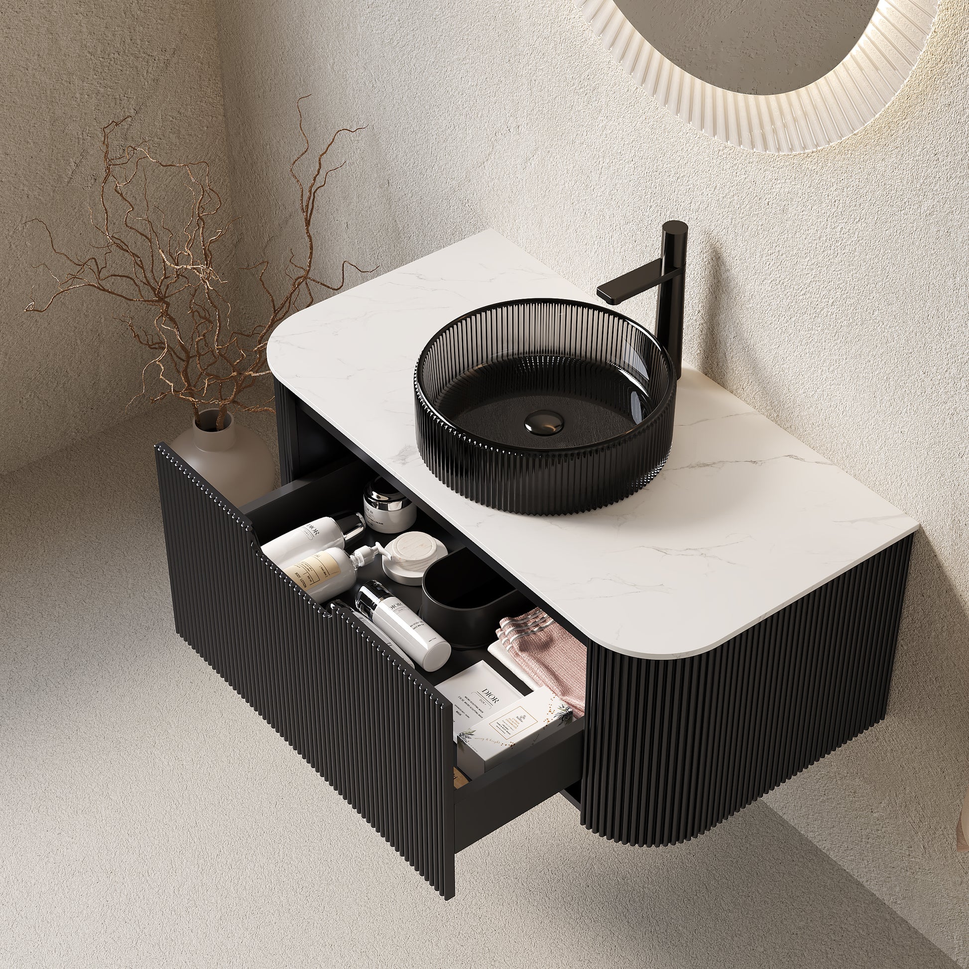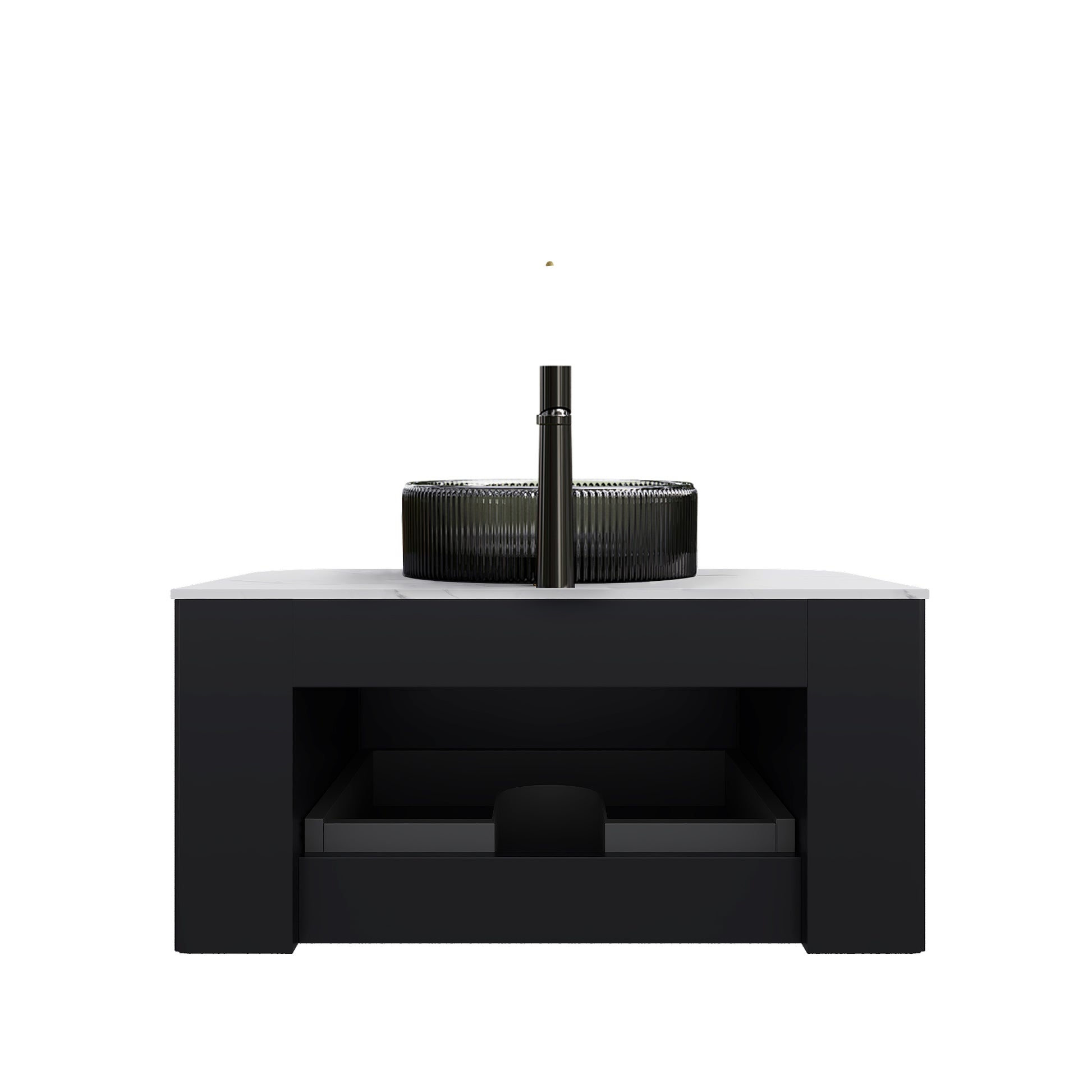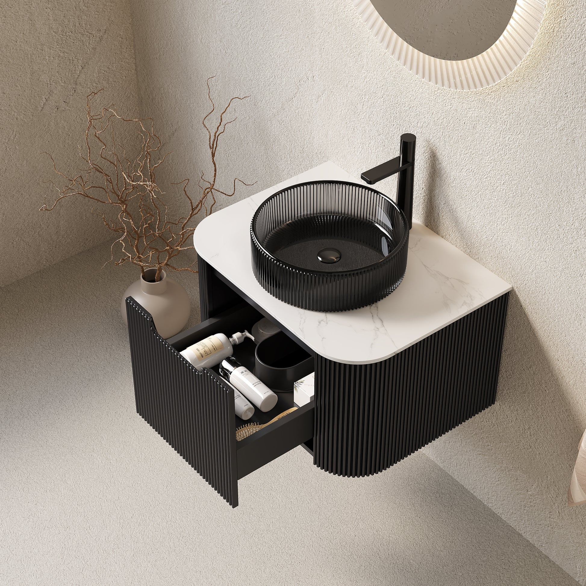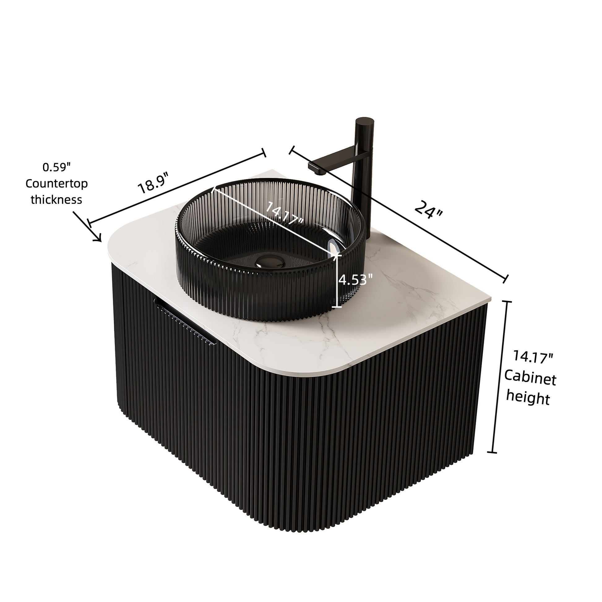 DINA 24" Bathroom Vanity with Sink, Wall-Mounted Curved Edges Striped Storage Cabinet with Drawer, Transparent Black Round Glass Basin and Countertop, Pre-assembled, Black Color