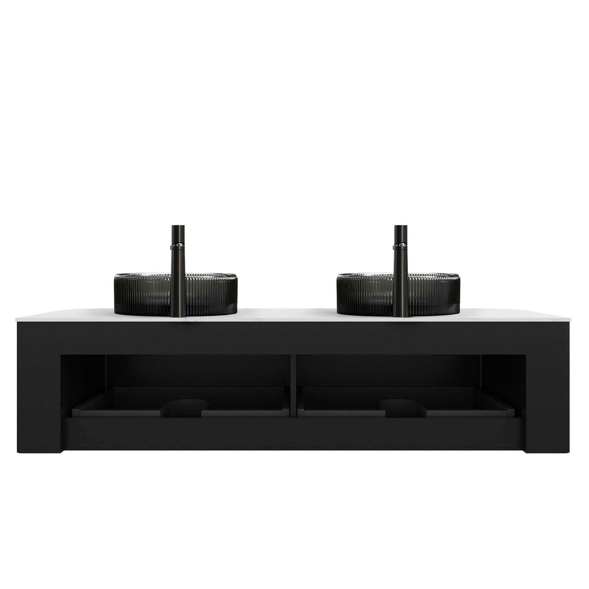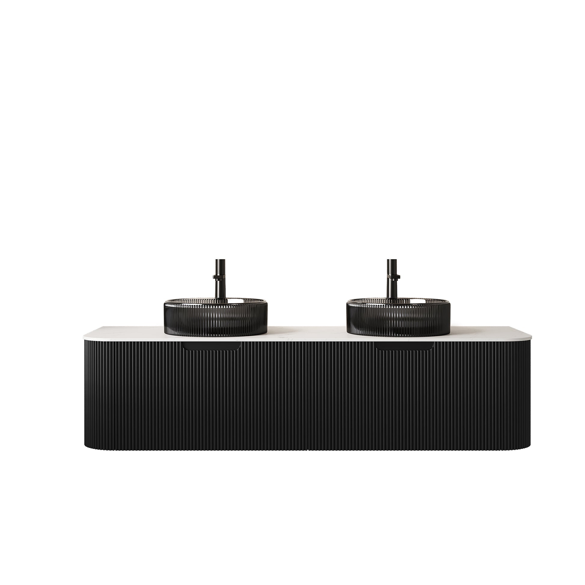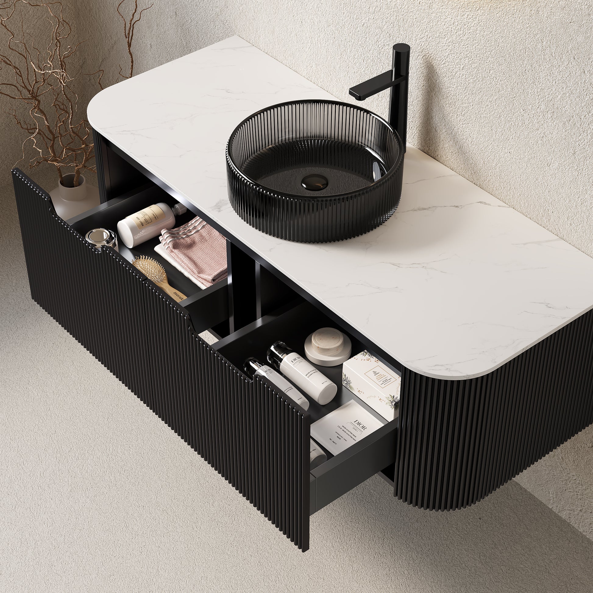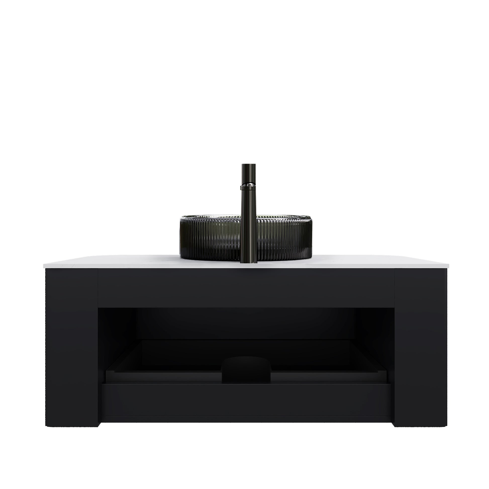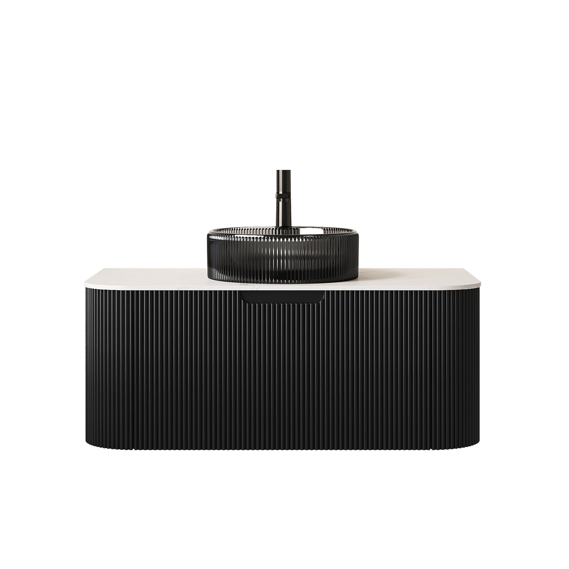 DINA 24" Bathroom Vanity with Sink, Wall-Mounted Curved Edges Striped Storage Cabinet with Drawer, Transparent Black Round Glass Basin and Countertop, Pre-assembled, Black Color