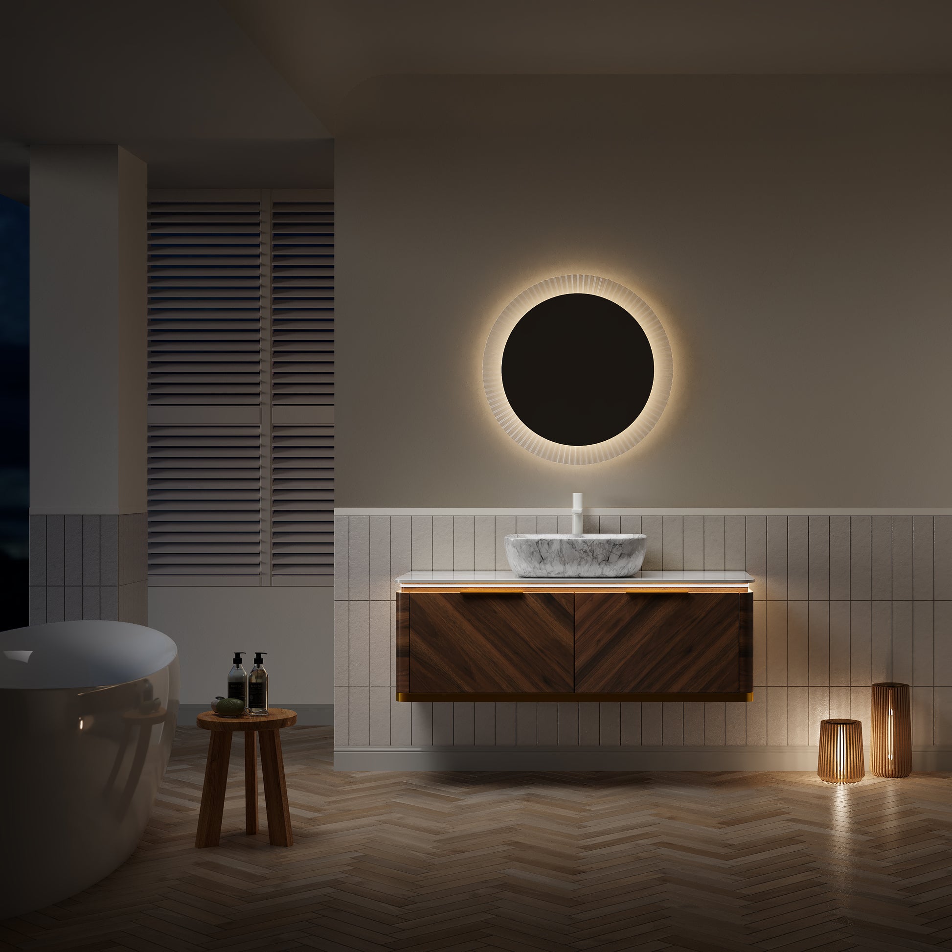 Automatisch erkennende LED-Streifen, die diskret unter der Arbeitsplatte angebracht sind, sorgen für freihändige Beleuchtung bei Nacht. Leuchtet automatisch auf, wenn sich eine Person nähert, Sie müssen das Licht nicht einschalten, wenn Sie gehen nachts auf die Toilette. Ihr sanftes Leuchten erhöht die Zweckmäßigkeit und schafft gleichzeitig eine anspruchsvolle Atmosphäre, die den Raum optisch vergrößert.