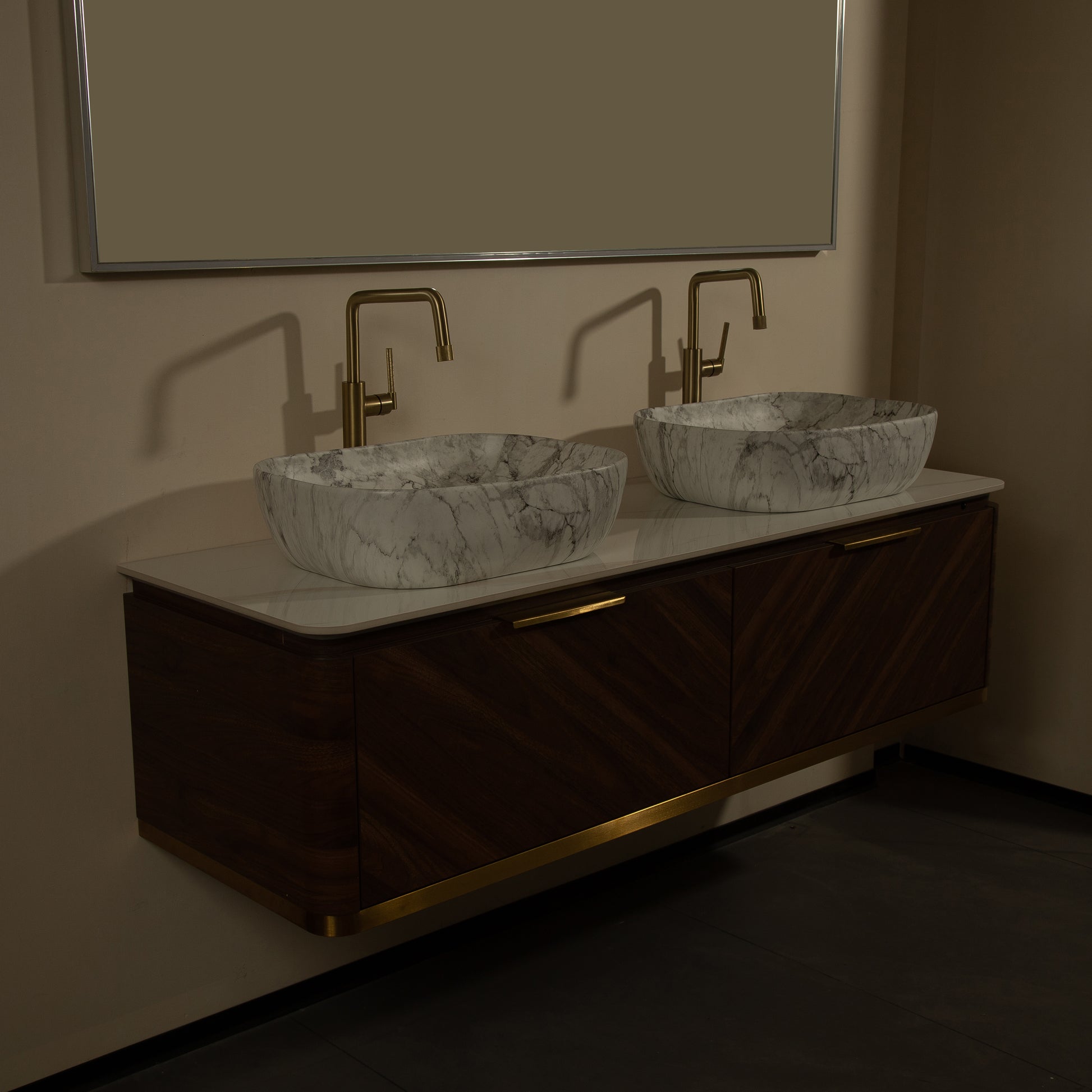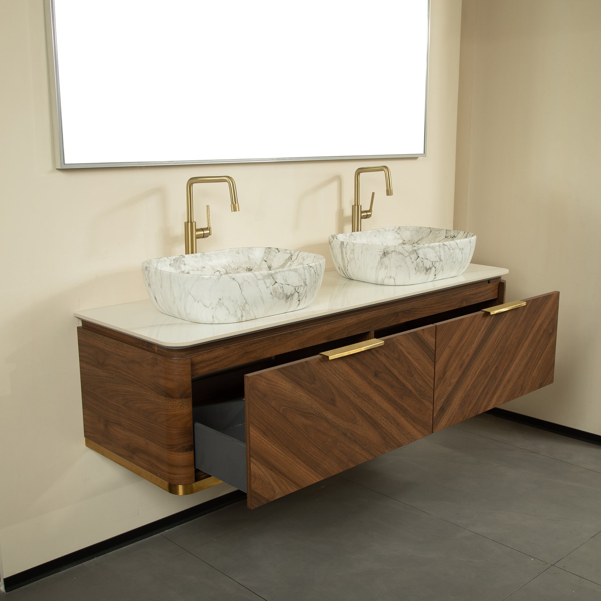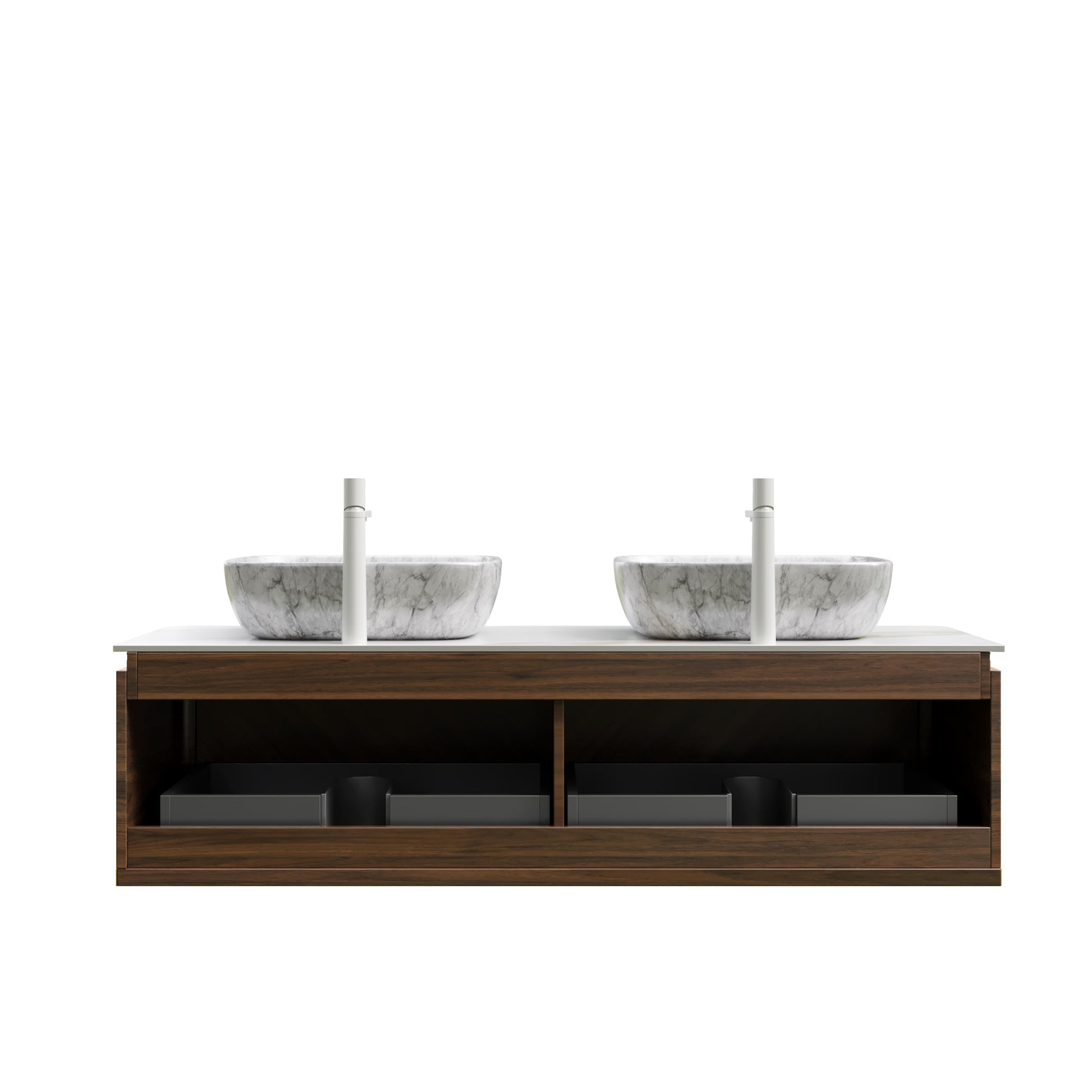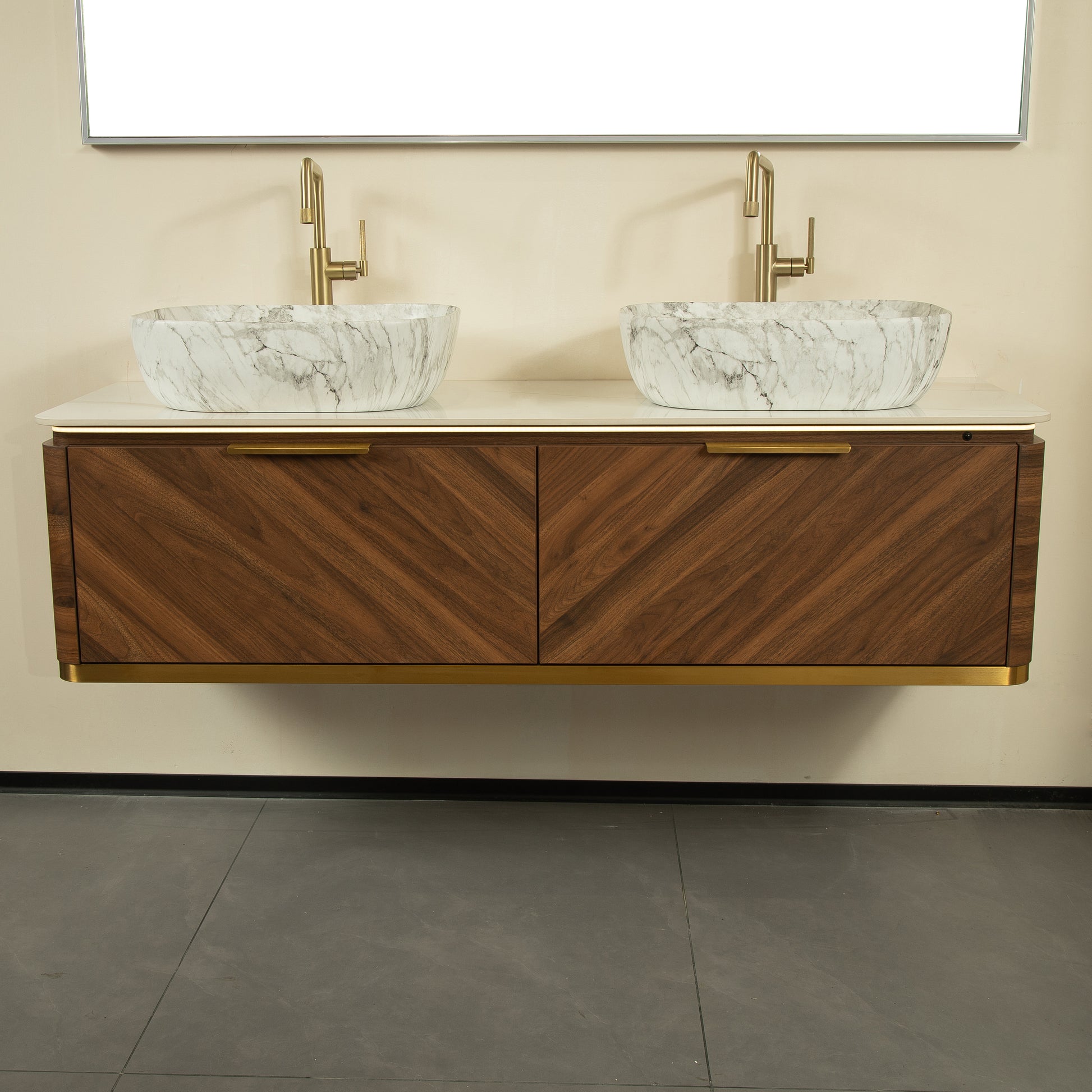 DIPA 60" Badezimmer-Waschtisch und Waschbecken, schwebender Sperrholz-Aufbewahrungsschrank, dunkle Walnussholzmaserung, gesinterte Steinplatte