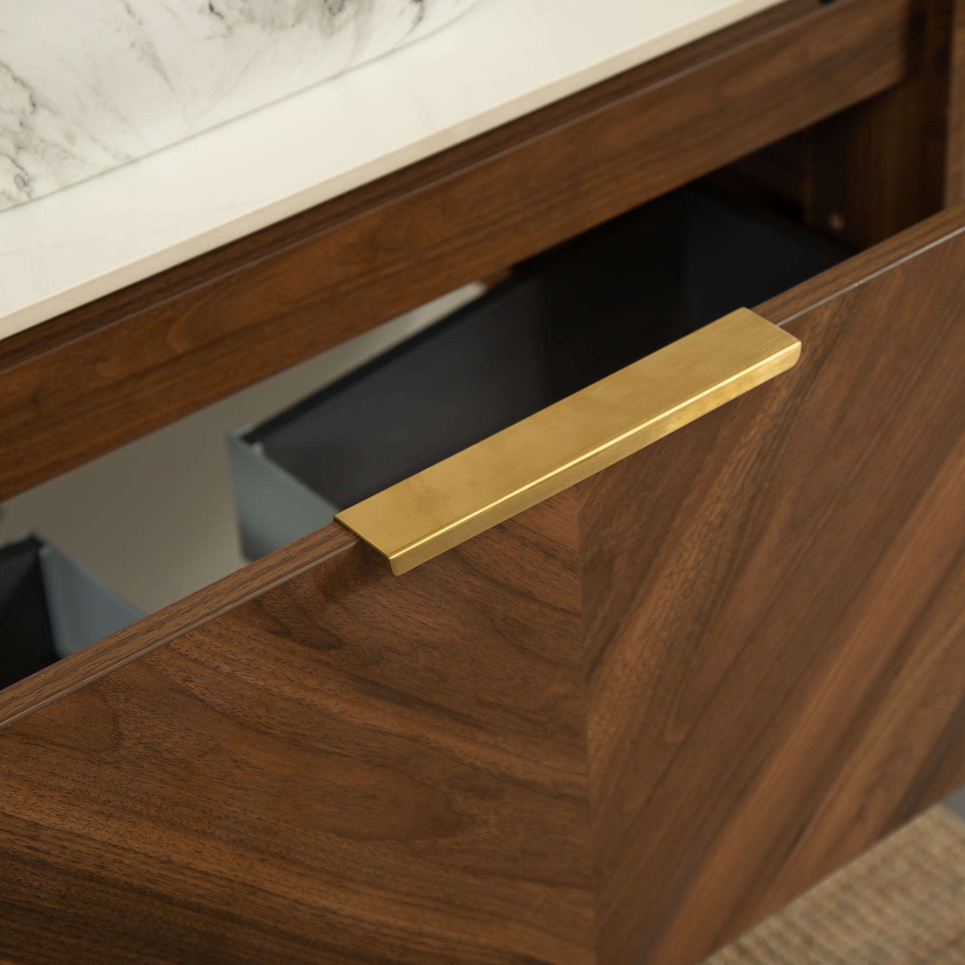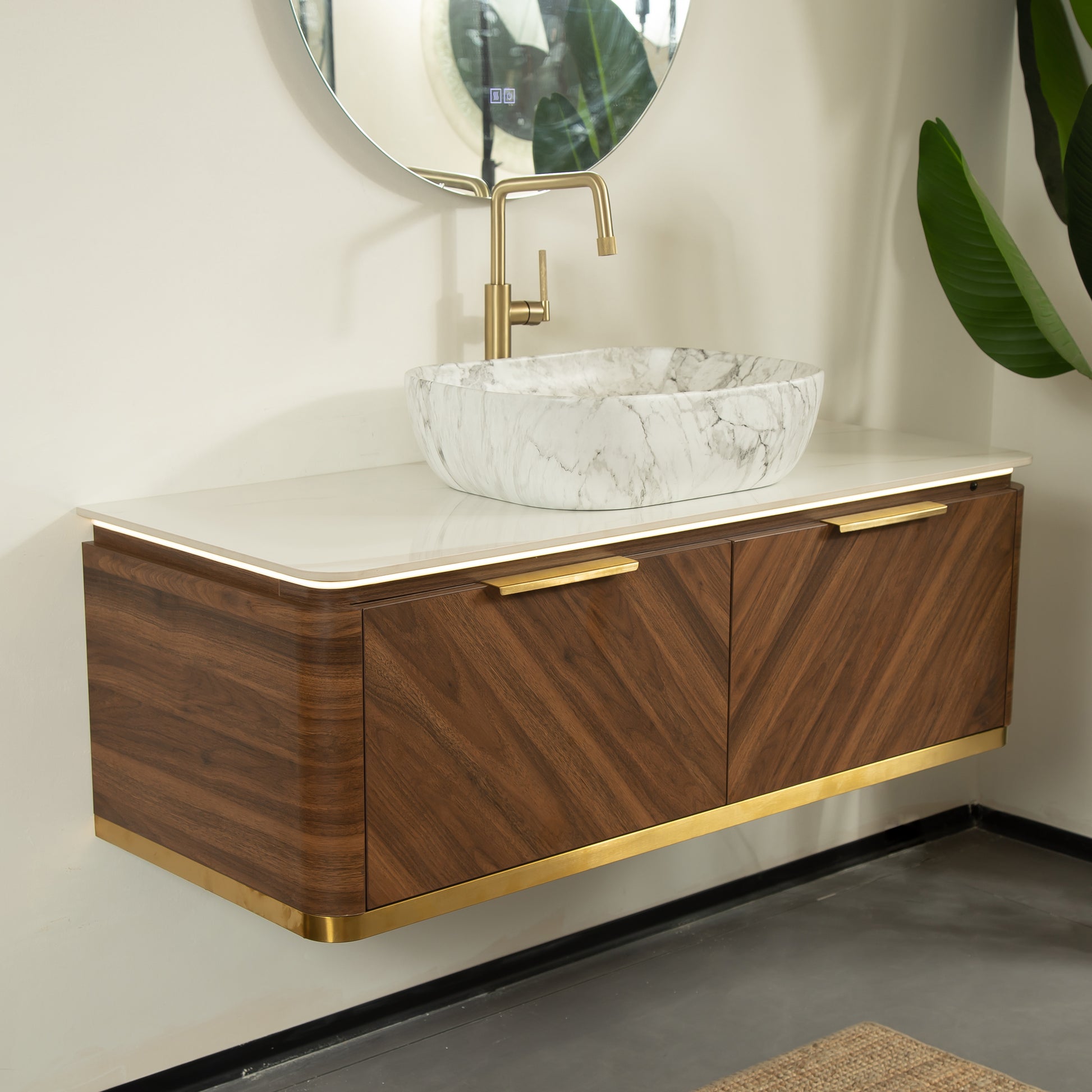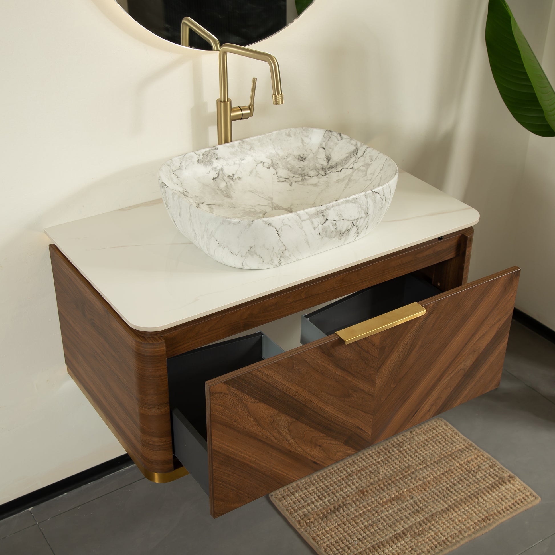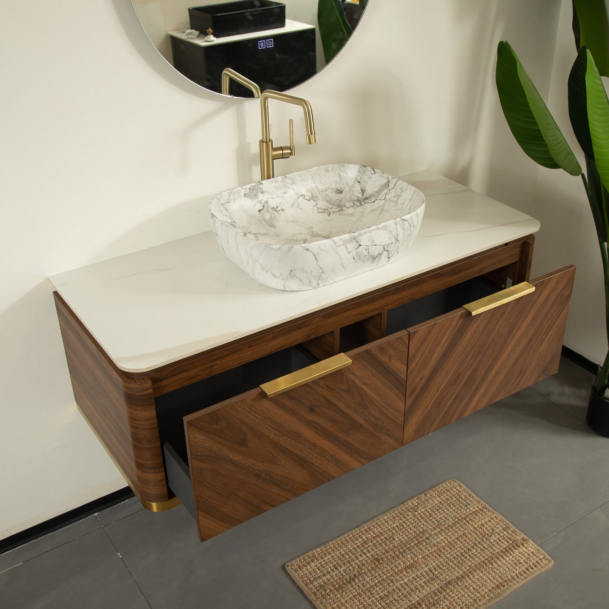 DIPA 60" Badezimmer-Waschtisch und Waschbecken, schwebender Sperrholz-Aufbewahrungsschrank, dunkle Walnussholzmaserung, gesinterte Steinplatte