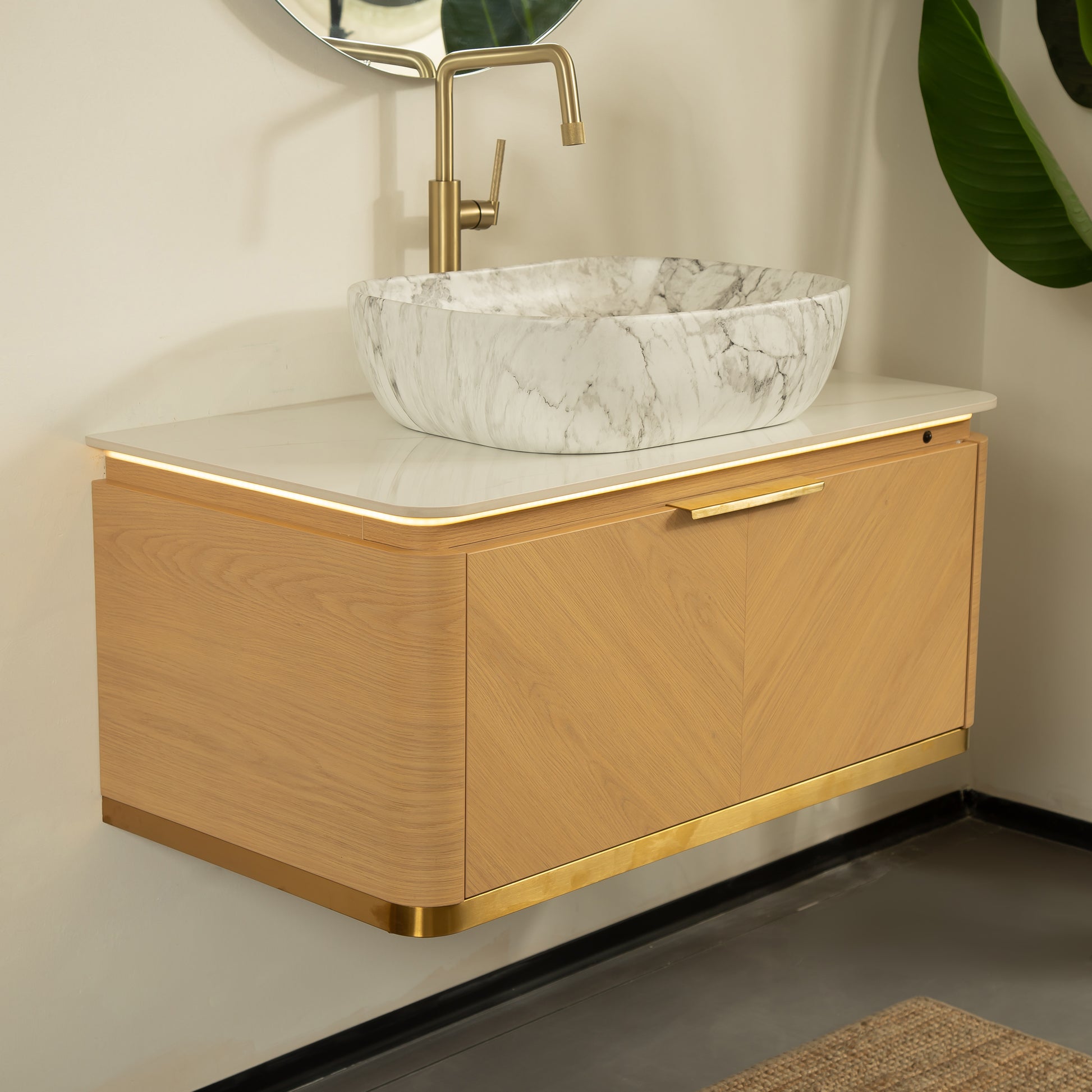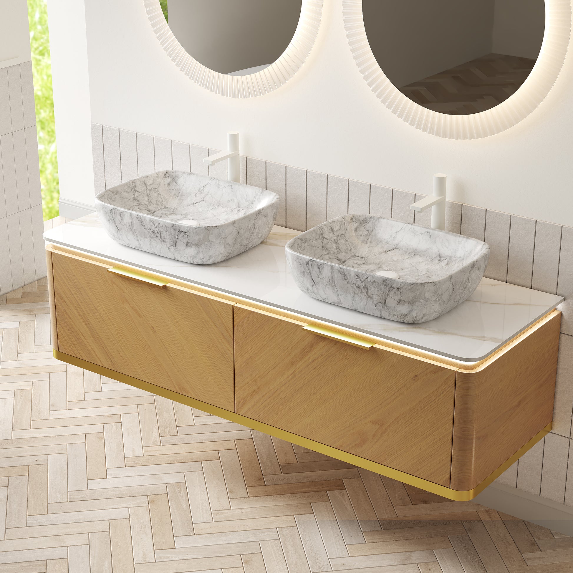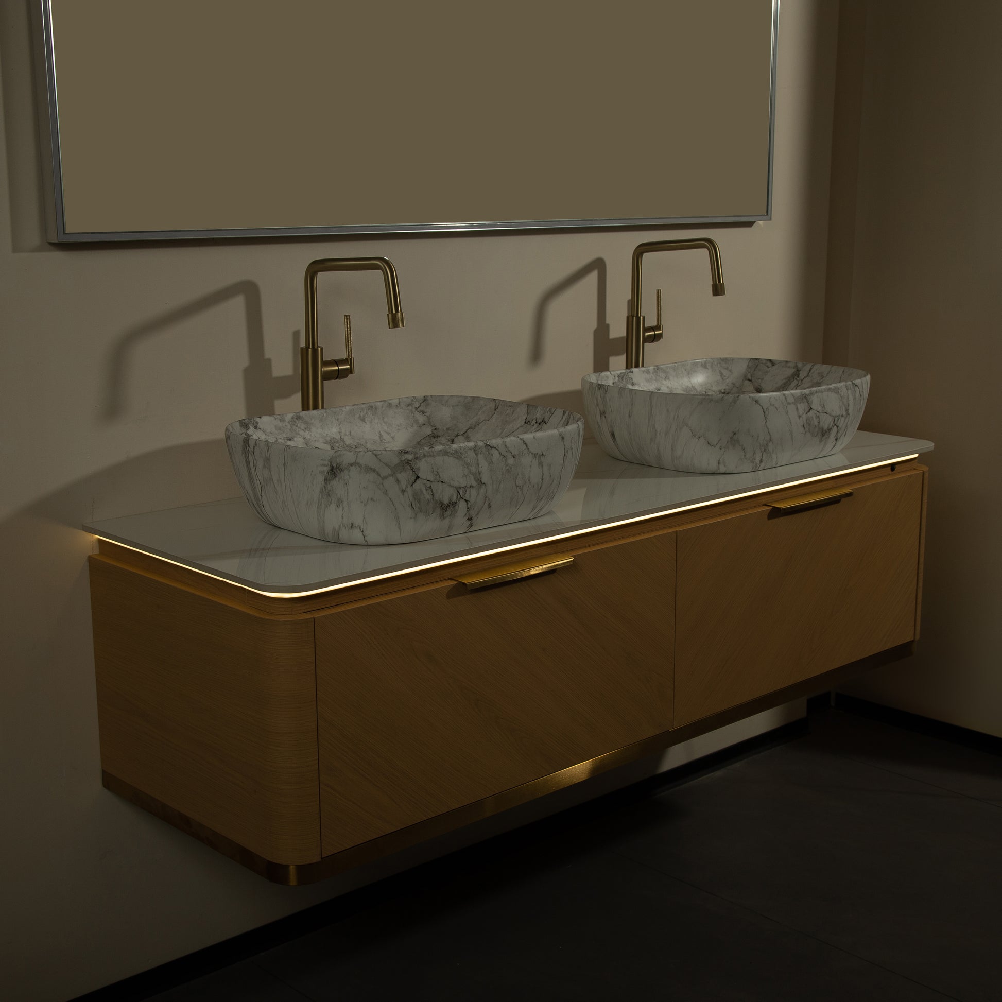 Zur Auswahl stehen hochwertige Aufsatzwaschbecken aus Keramik und Glas mit beeindruckender Ästhetik. Ihr schlichtes Design harmoniert perfekt mit dem Unterschrank, während die hochwertigen Materialien eine mühelose tägliche Pflege gewährleisten.