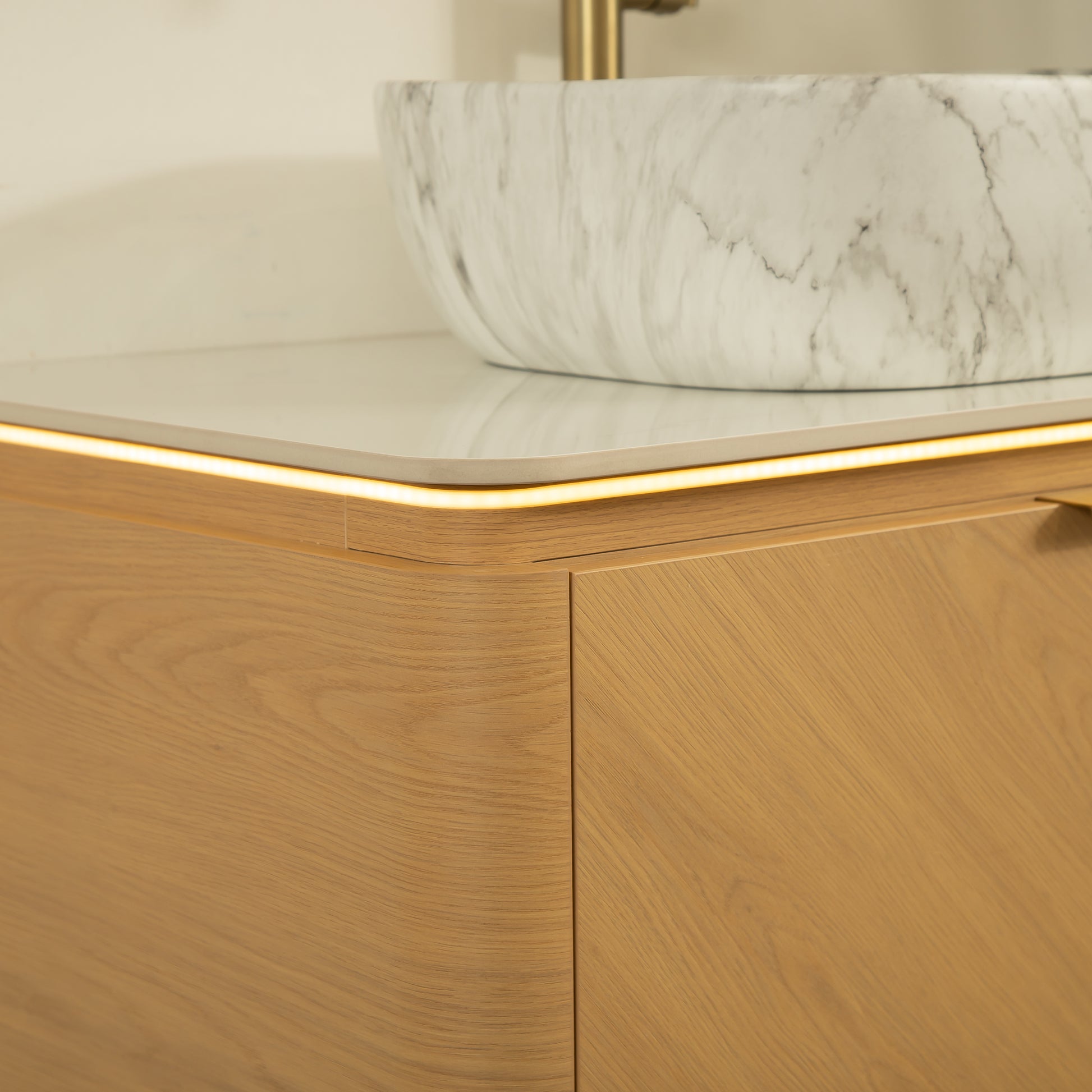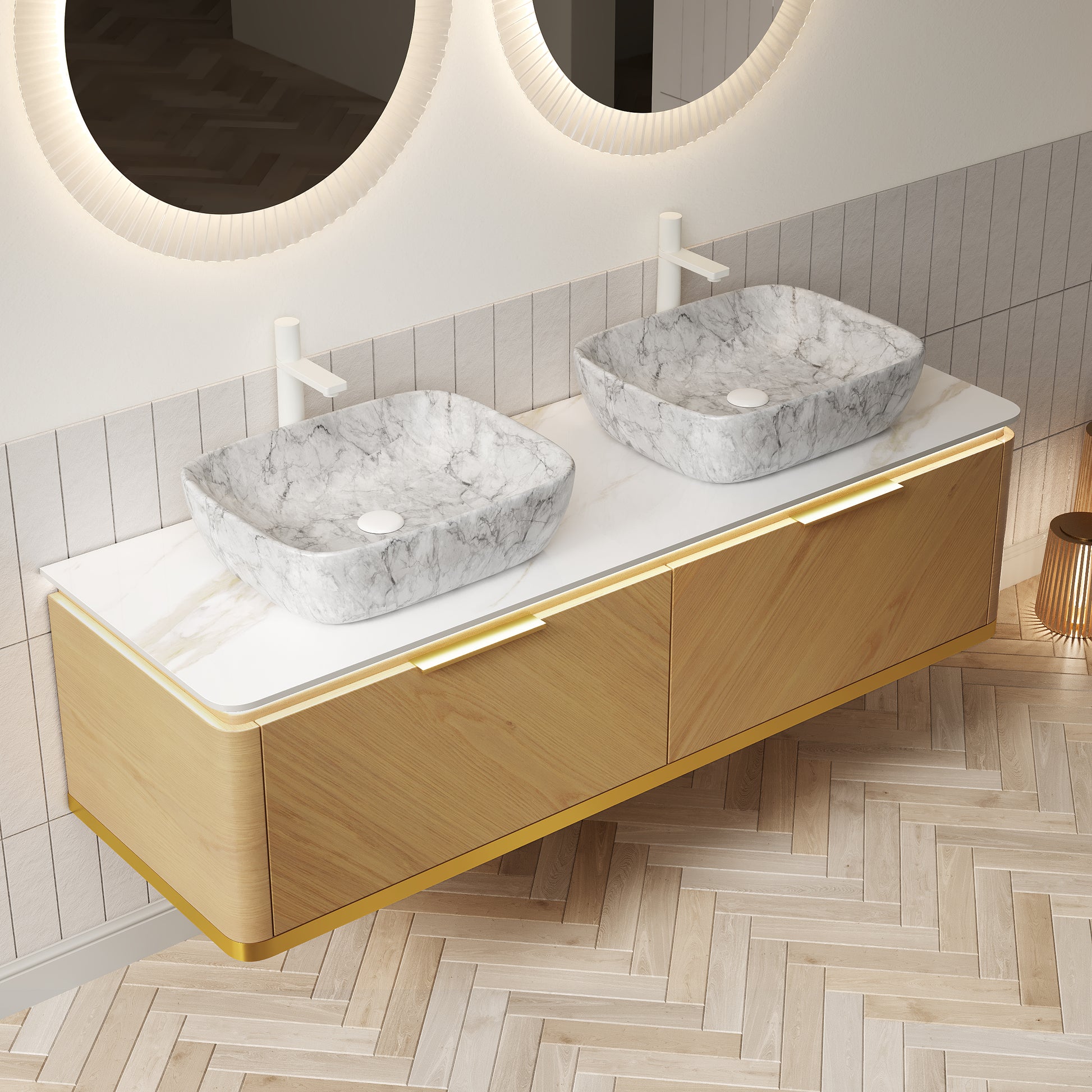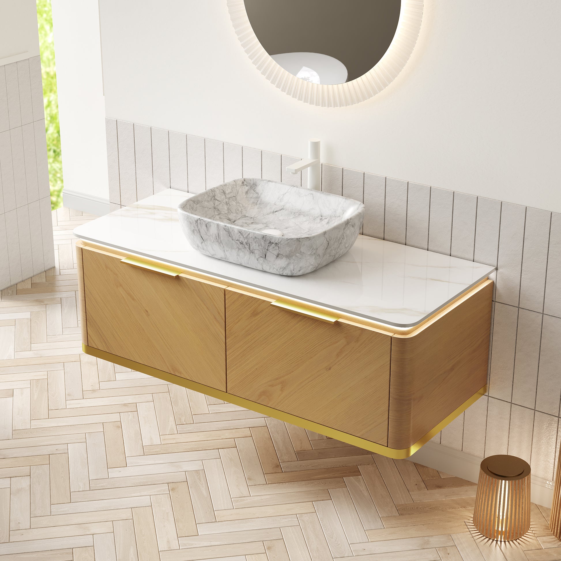 A Premium- Sinterstein- Arbeitsplatte , erzeugt eine natürliche Marmor-ähnliche Optik, die einen Hauch von luxuriöse Atmosphäre zum Badezimmer.