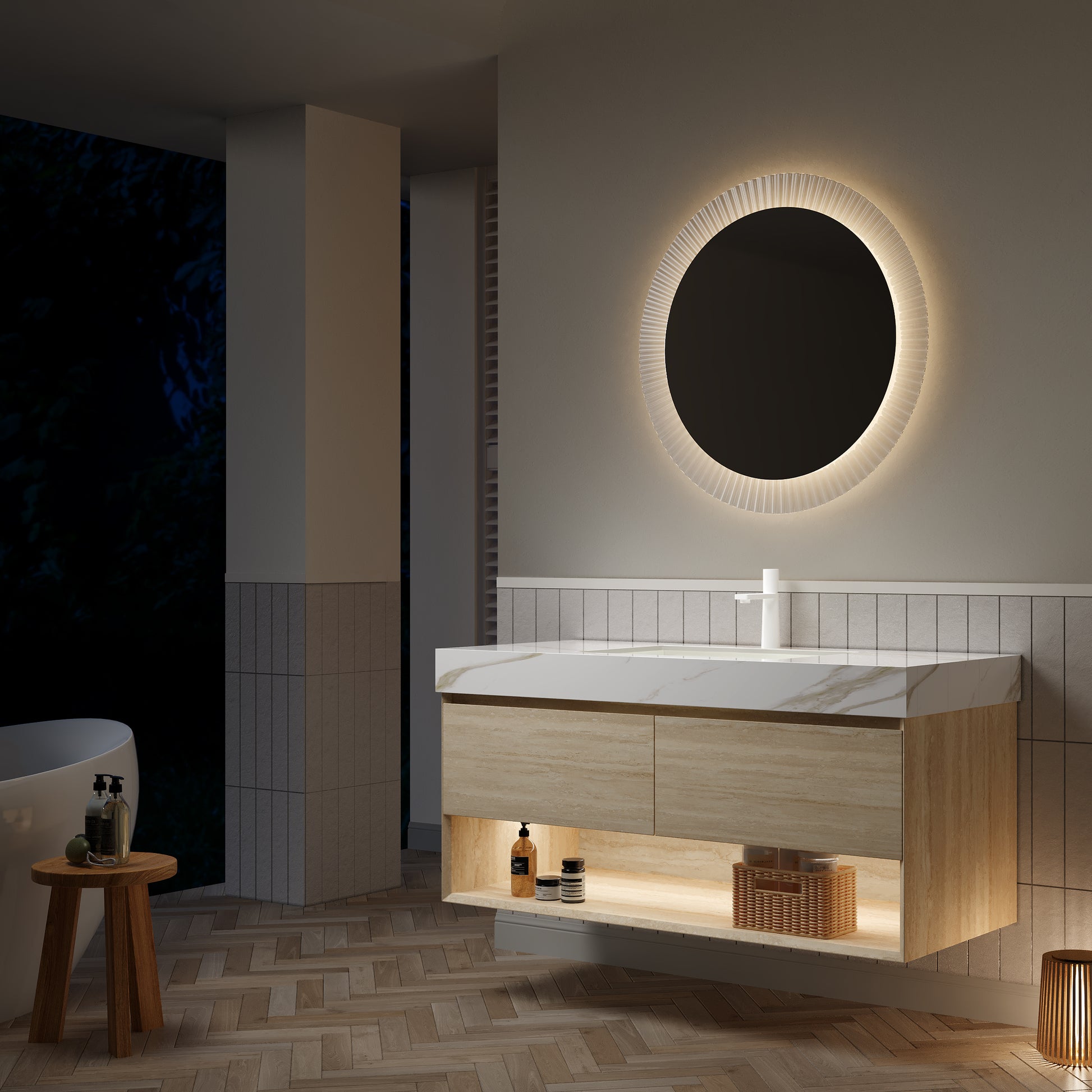 FRIGGA 30" Badezimmer-Waschtisch und Waschbecken, schwebender Sperrholz-Aufbewahrungsschrank, Schublade und Regal mit Sensorlicht