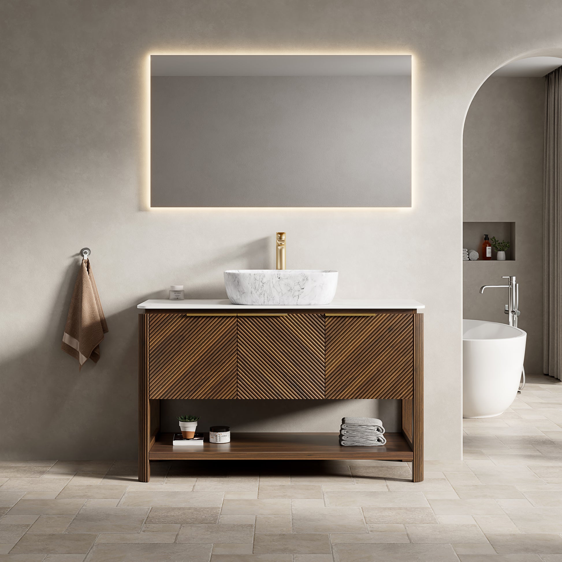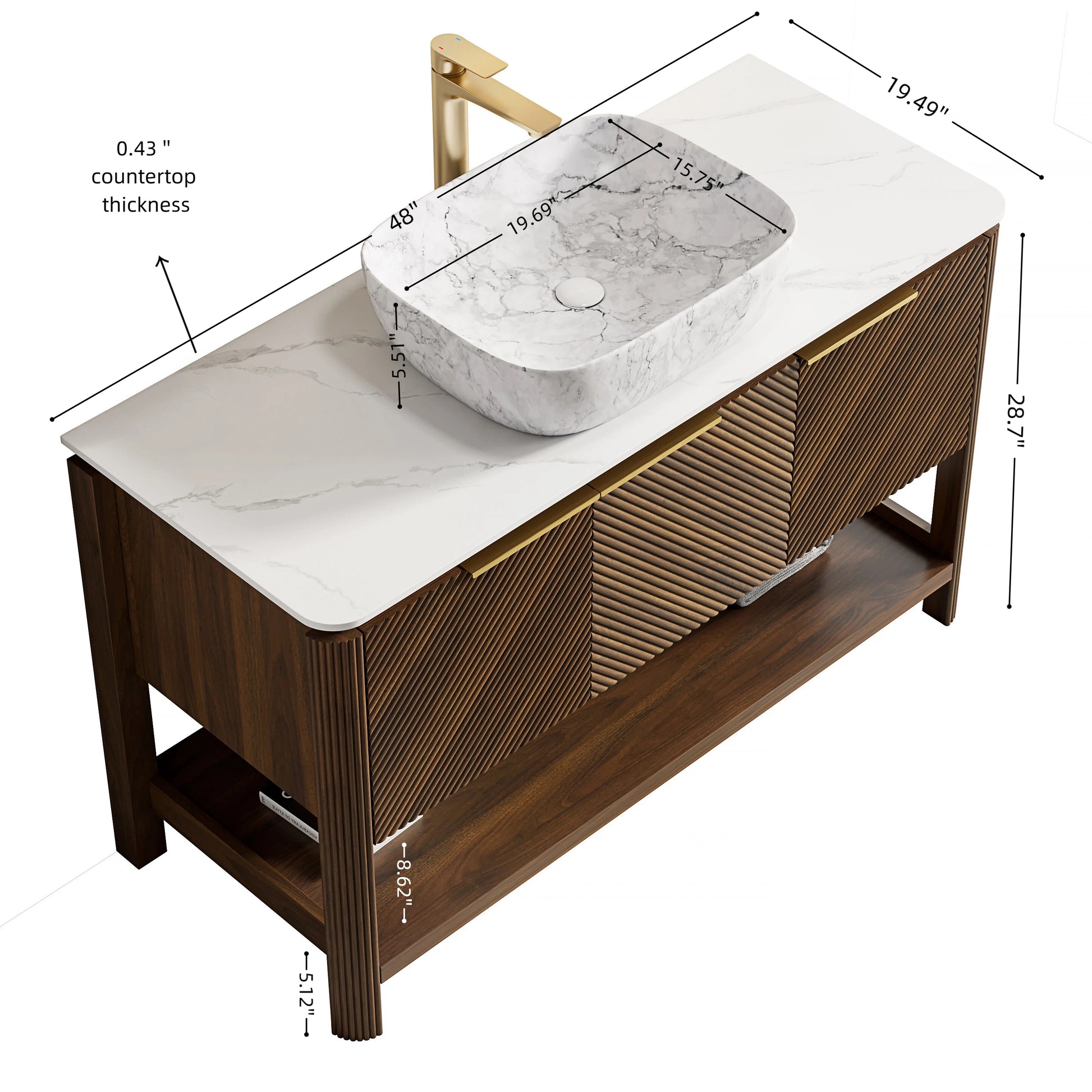 INDIGO 60" Bathroom Vanity&Sinks, Freestanding Plywood Storage Cabinet with 4 Diagonal Striped Doors&Open Shelf, 2 Marble Pattern Ceramic Basins&Carrara White Sintered Stone Top, Dark Walnut Woodgrain
