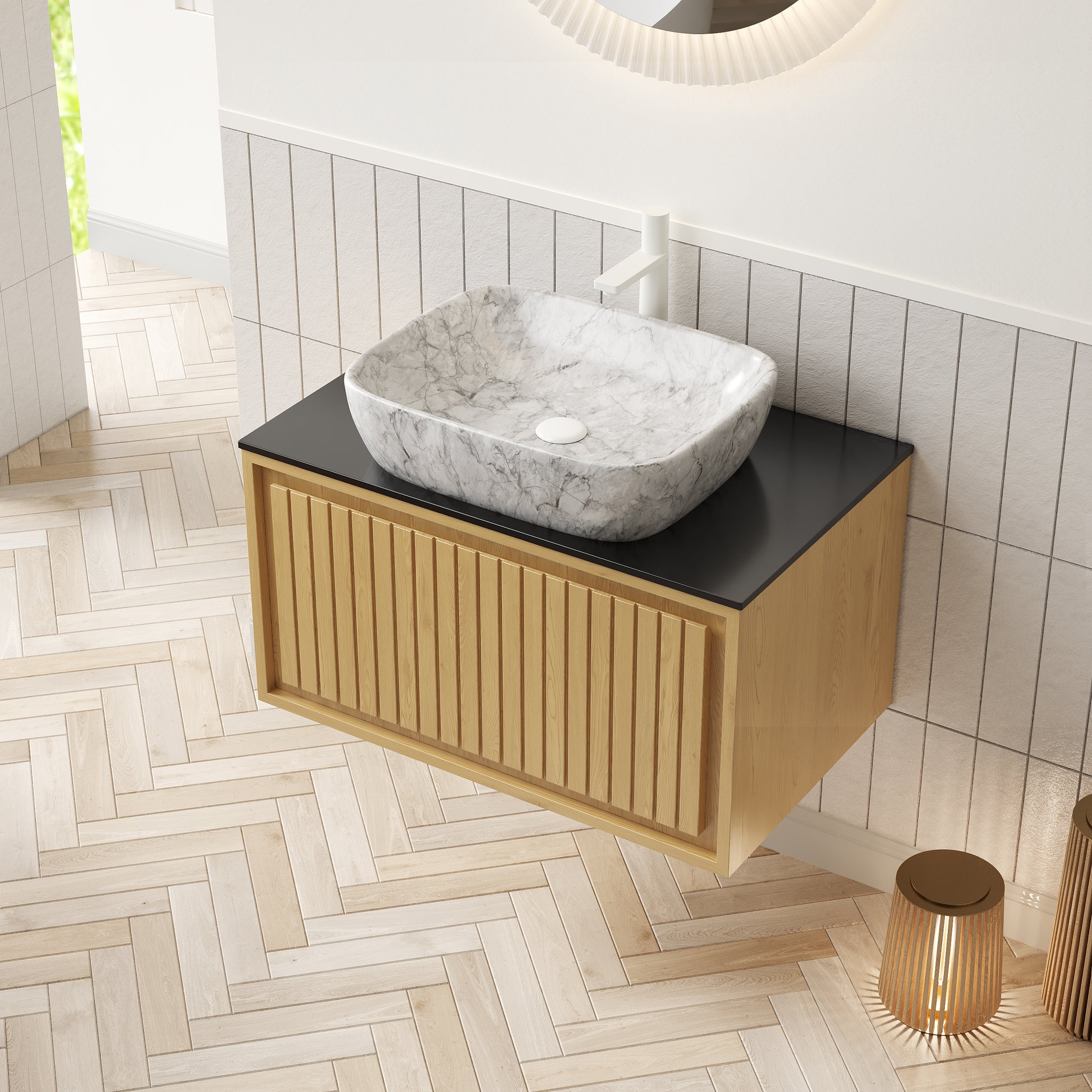 KOLAS 30" Bathroom Vanity&Sink, Wall-Mounted Plywood Bathroom Storage Cabinet with Drawer, Marble Pattern Ceramic Vessel Basin&Black Sintered Stone Top