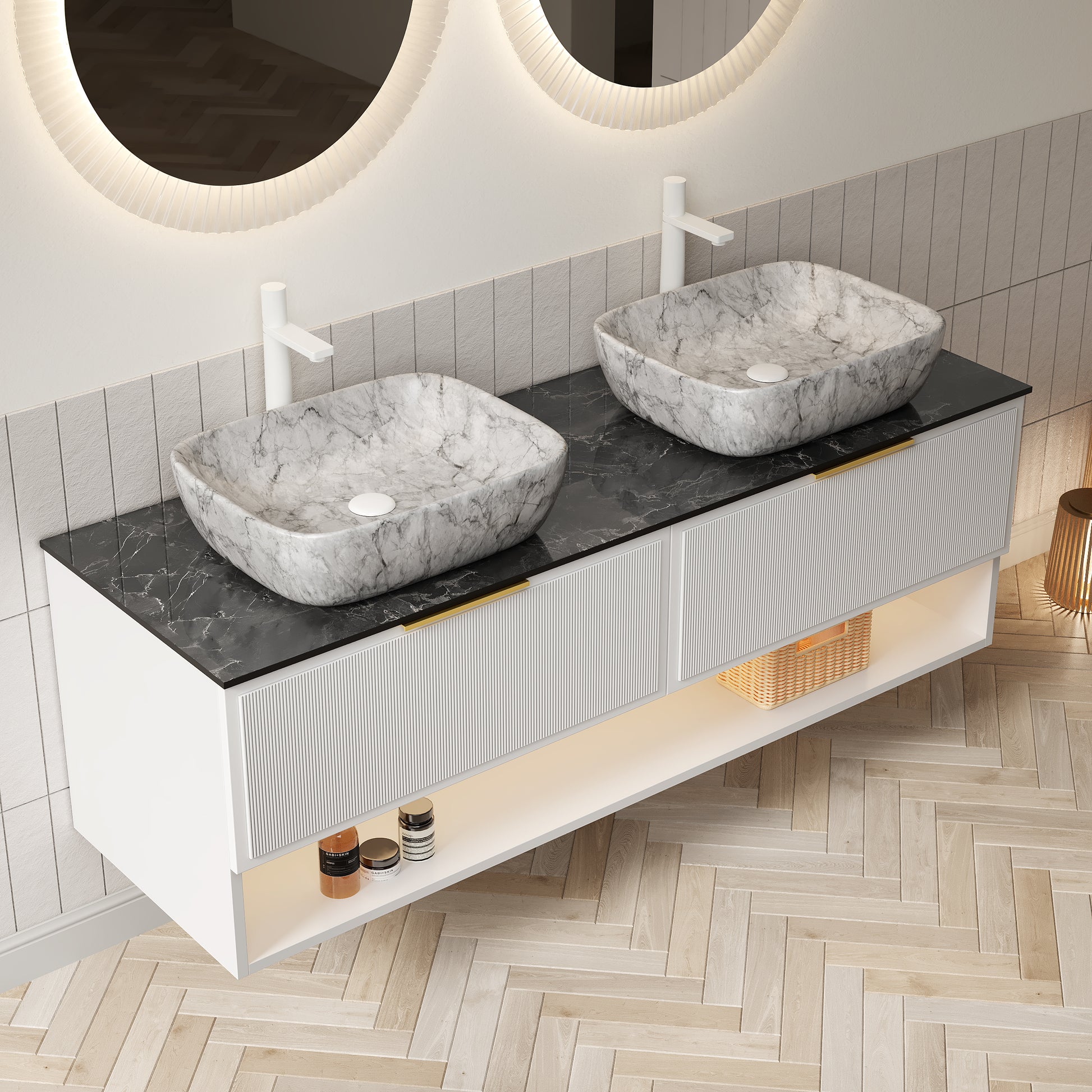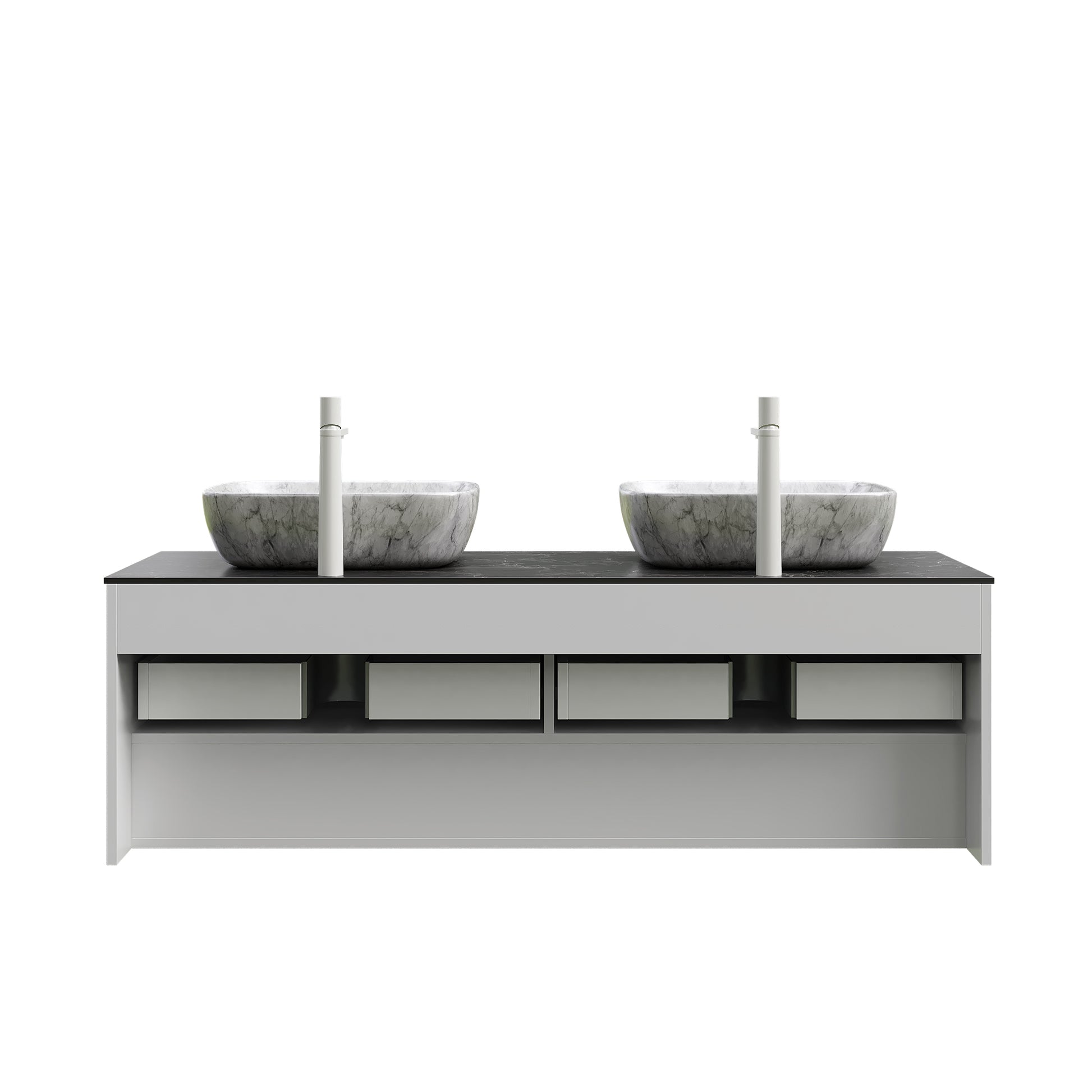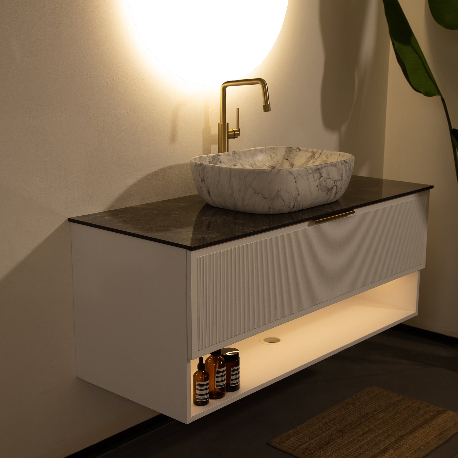 Die Arbeitsplatte aus Sinterstein Black Bess – die die Farbe einer Art schwarzen Marmors imitiert – ist pflegeleicht, da sie flecken- und kratzfest ist und sich daher ideal für den täglichen Gebrauch eignet. Sie erzeugt eine natürliche Marmoroptik und verleiht dem Badezimmer einen Hauch von Luxus.
