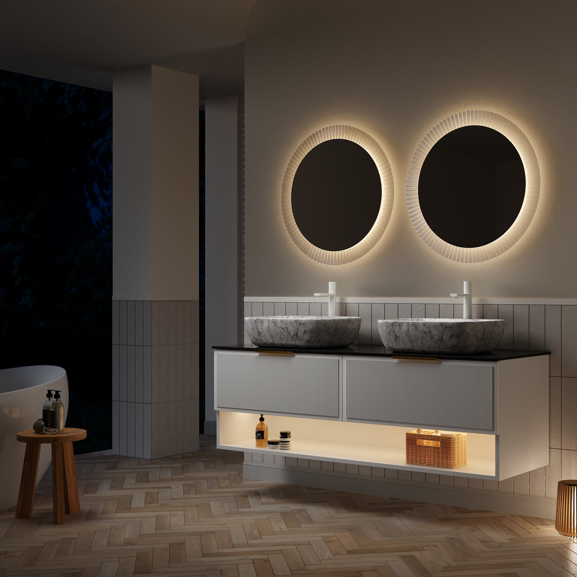 Die offenen Regale des Schranks sind mit LED-Lichtleisten ausgestattet, die geschickt über den Regalen angebracht sind, sodass die Lichtleisten nicht sichtbar sind und nur ihr sanftes Leuchten durchscheint. Die Leuchte schaltet sich automatisch ein, wenn sich eine Person nähert. Sie müssen das Licht nicht einschalten, wenn Sie gehen nachts auf die Toilette.