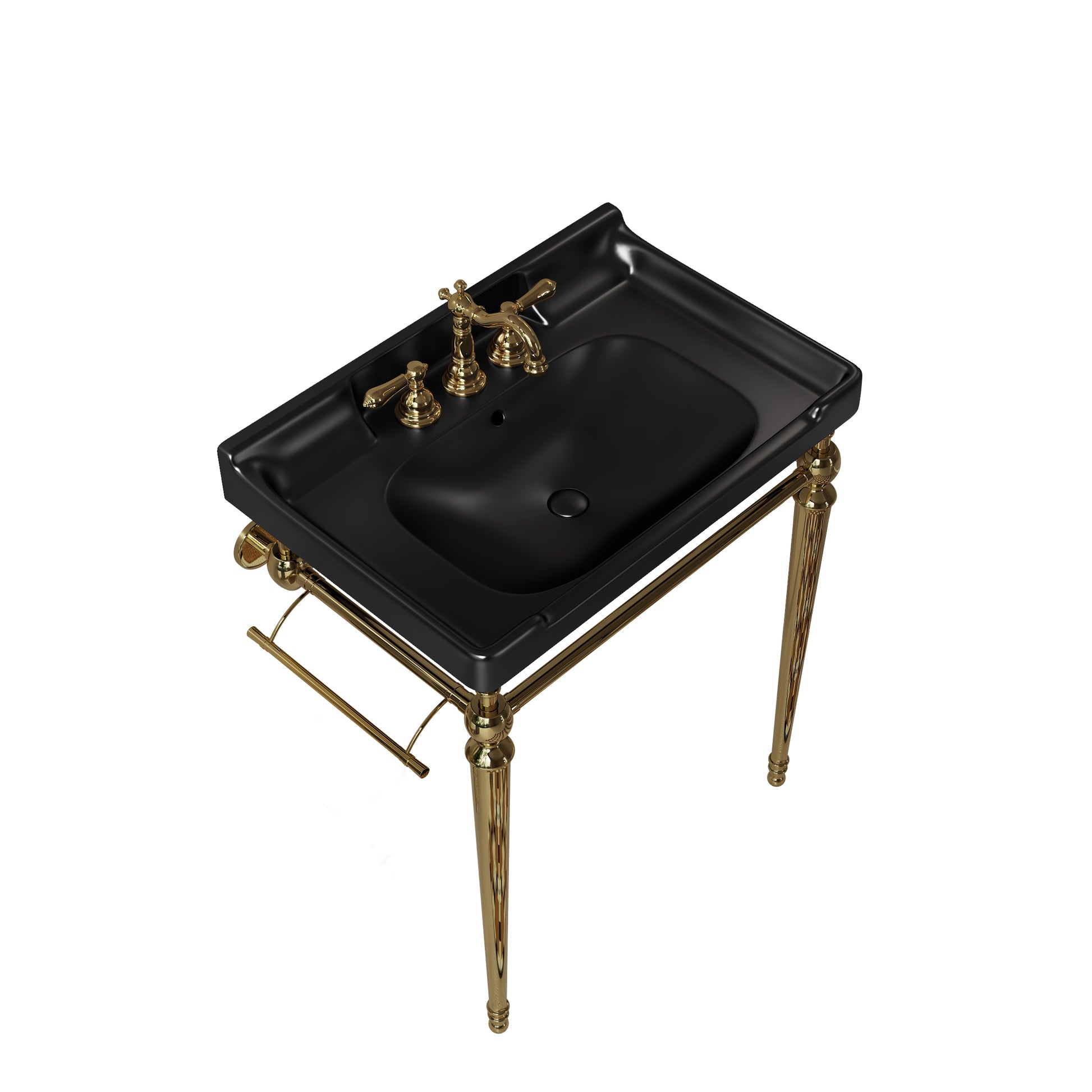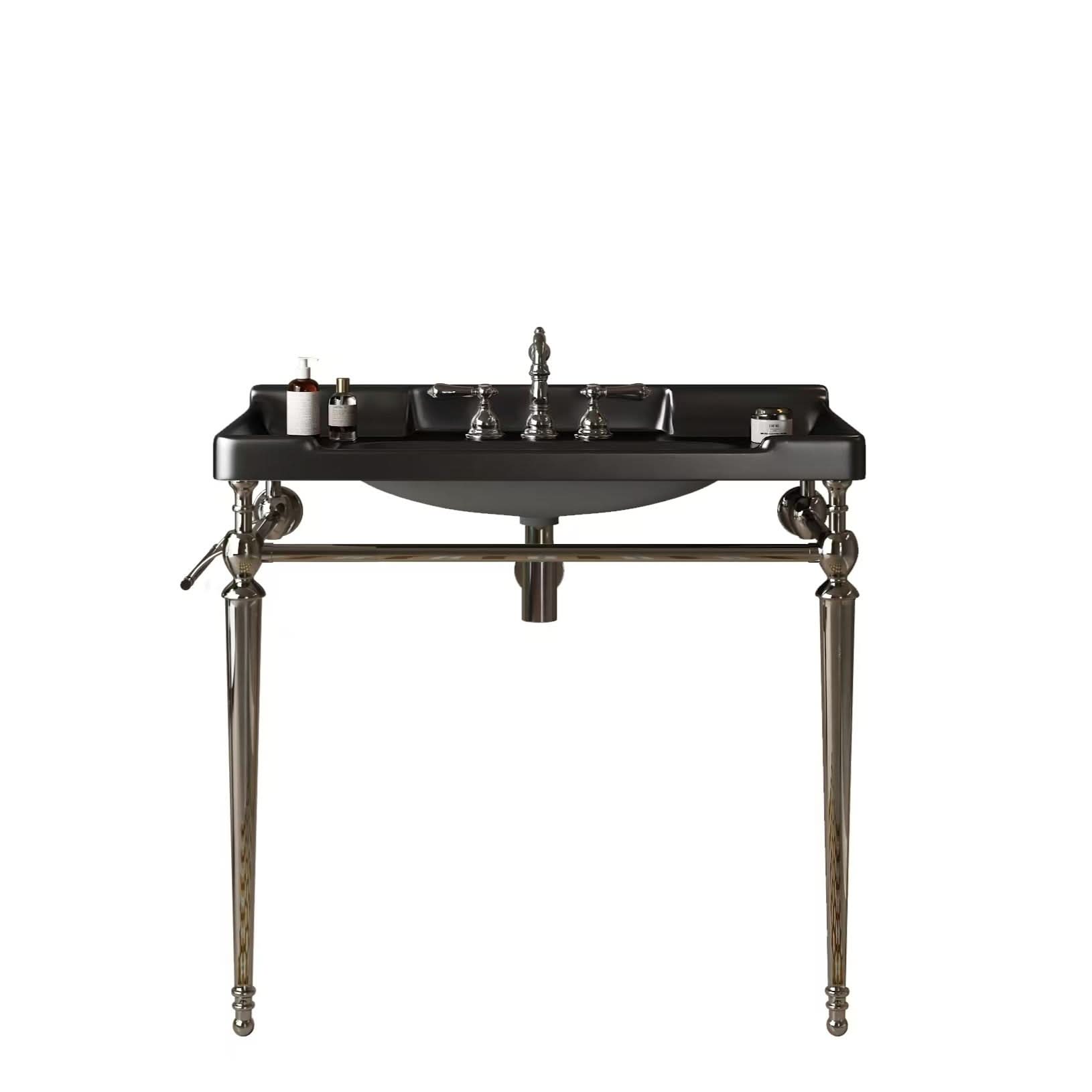 VICI 36" Badezimmer-Konsolenwaschbecken, wandmontiertes schwarzes Keramikwaschbecken mit 3 vorgebohrten Wasserhahnlöchern, freistehende Stützbeine aus Edelstahl mit Handtuchhalter