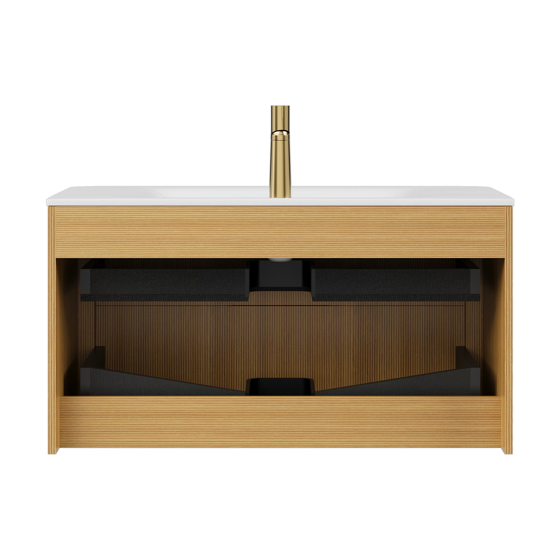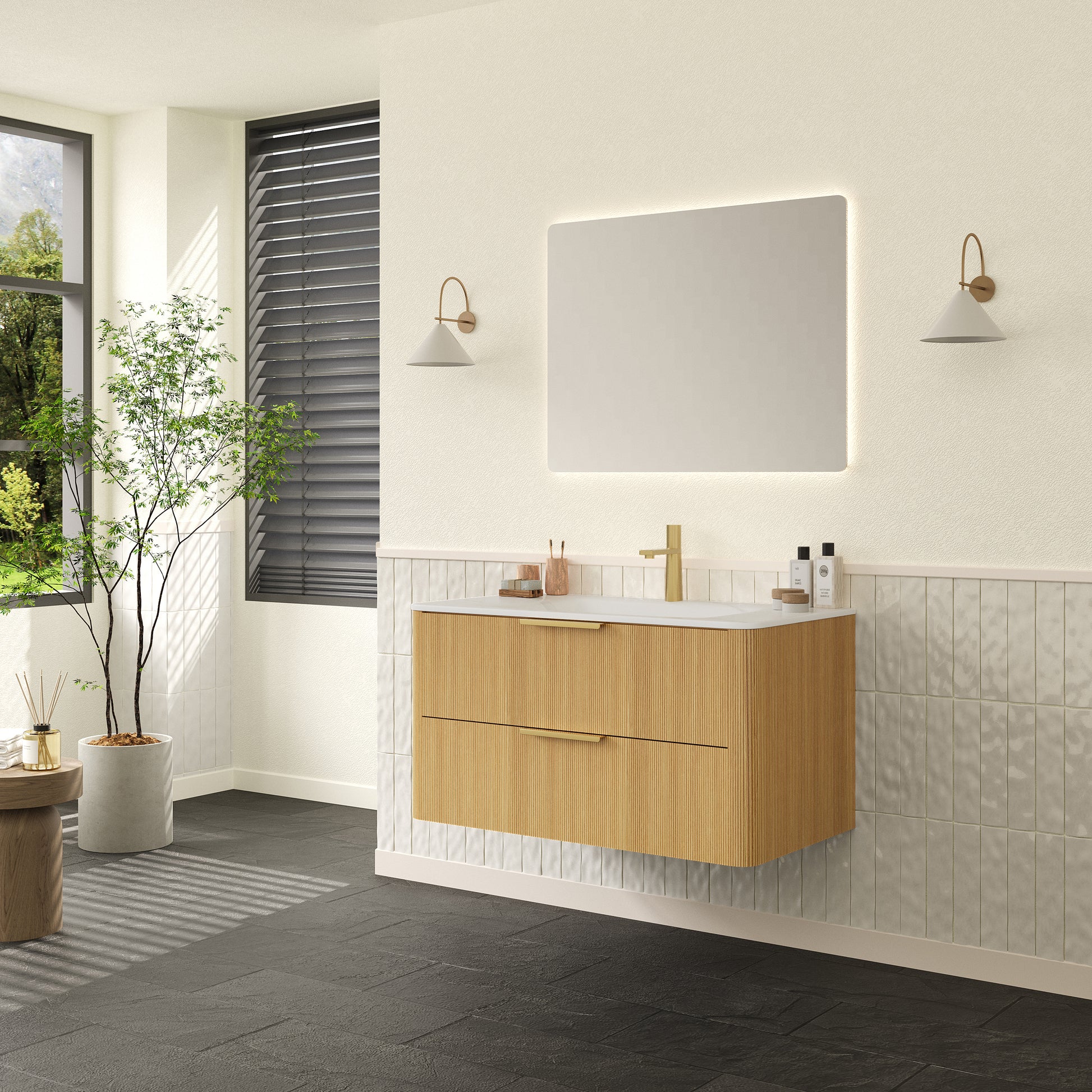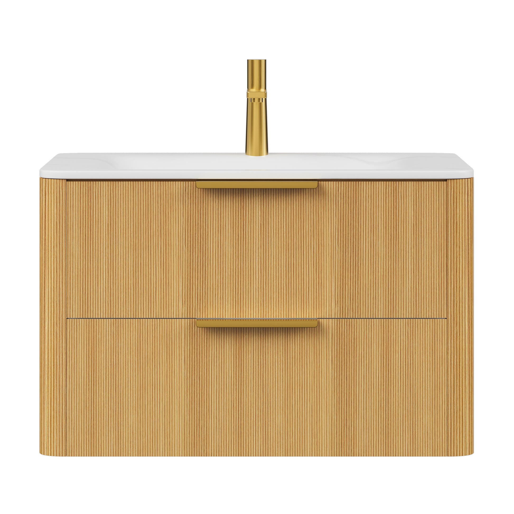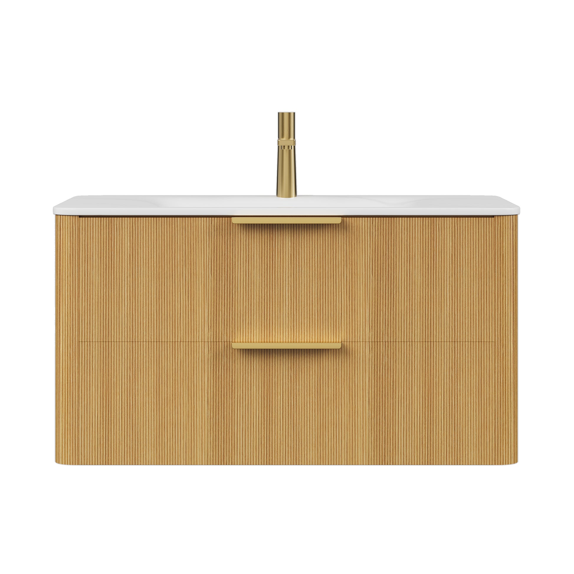 ZANE 36" Badezimmer-Waschtisch mit Waschbecken, schwebender Aufbewahrungsschrank aus Sperrholz mit ultra-Nadelstreifen und Schubladen, helle natürliche Holzmaserung