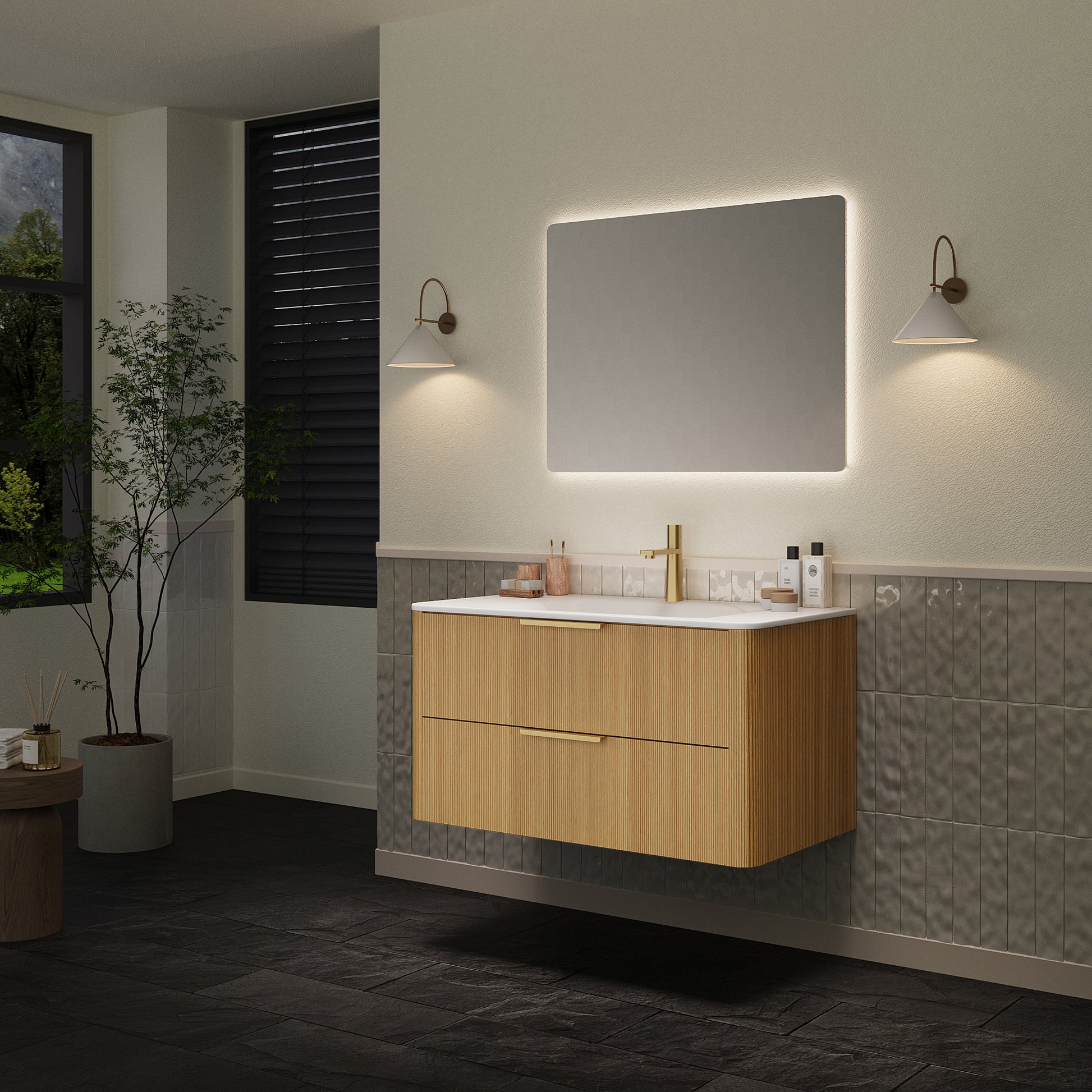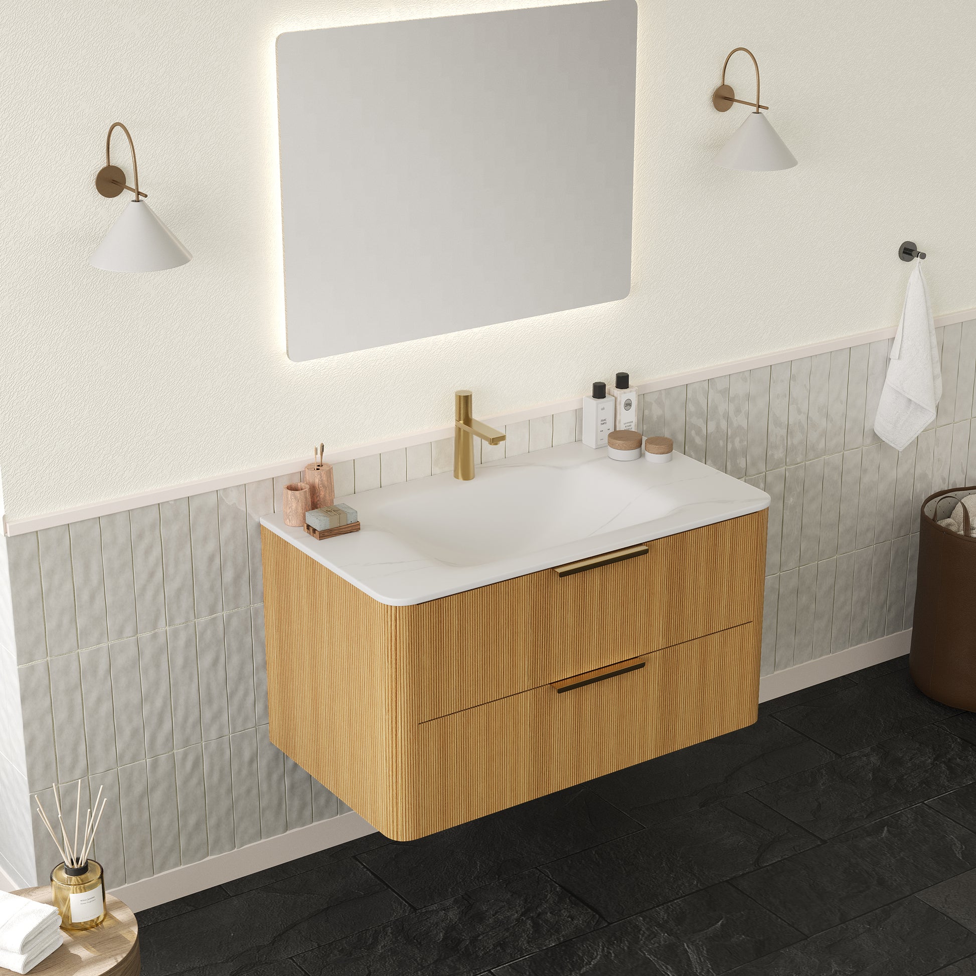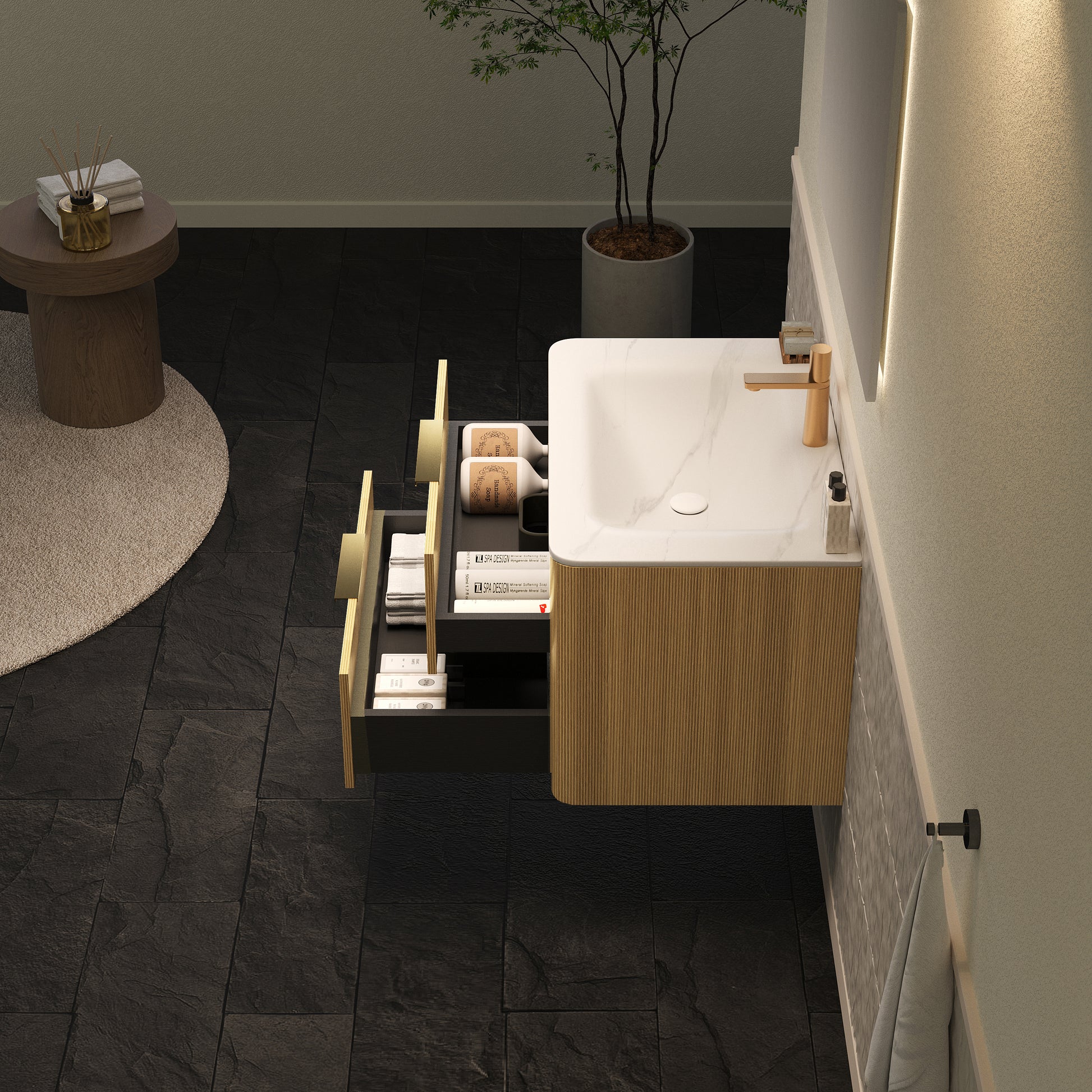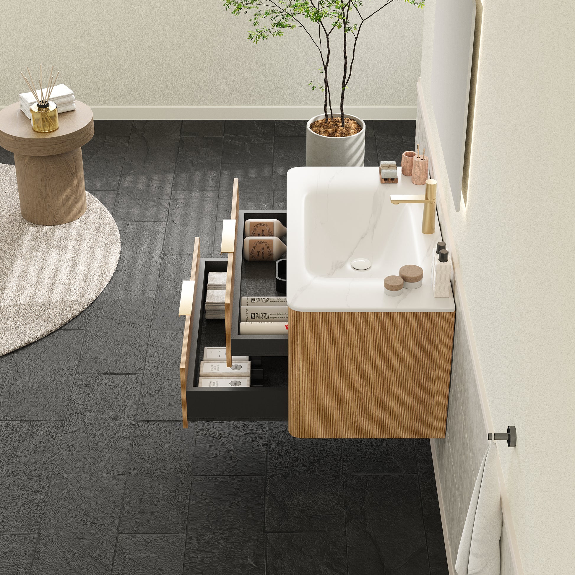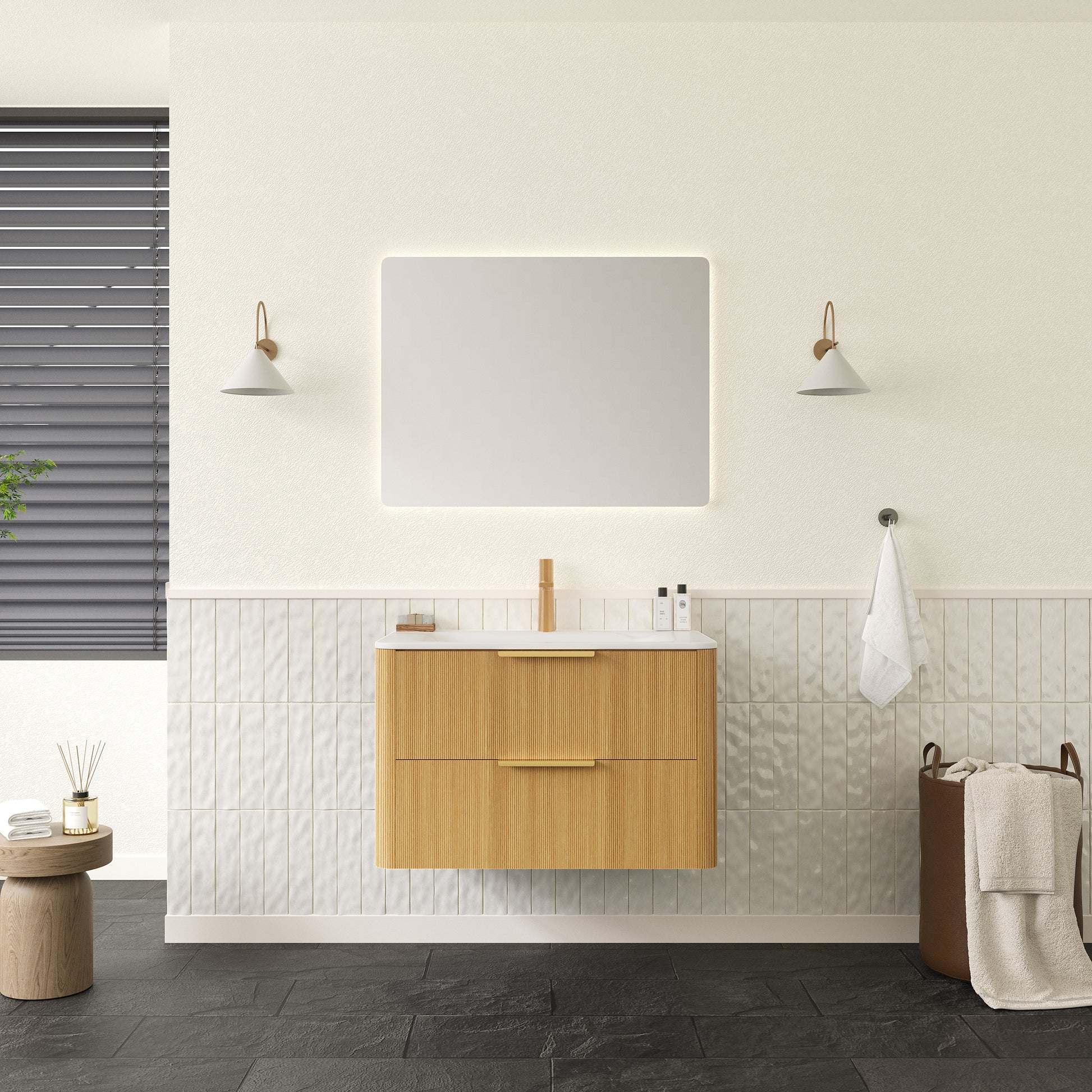 ZANE 36" Badezimmer-Waschtisch mit Waschbecken, schwebender Aufbewahrungsschrank aus Sperrholz mit ultra-Nadelstreifen und Schubladen, helle natürliche Holzmaserung