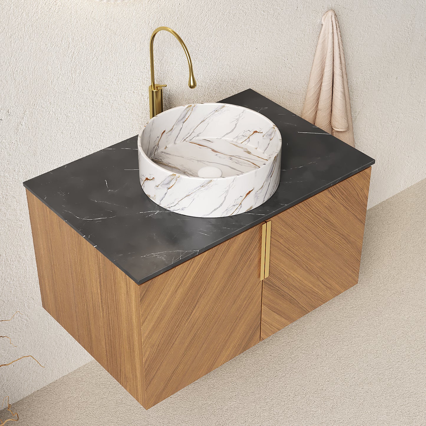 - feature hazy gray veined textures that echo the black sintered stone countertop with marble patterns, creating an atmosphere of grandeur and stability. (Please note that due to the natural textures of the stones, the texture of each countertop is unique.) These basins made of strong hardness ceramic, comes with a standard-sized pre-drilled faucet hole. It has excellent durability and stain resistance, easy to maintain, standing up to long-term use. Please be noted that faucet mounting hole size :1.38'', the height of faucet spout ≥9'' is recommended. The sink drain stopper without overflow hole is recommended.