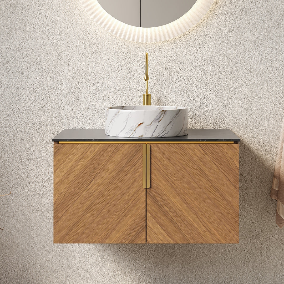 - Brown Oak Grain Finish with Diagonal Design The cabinet is finished with a brown oak grain, exuding a sense of calm and elegance. The door panels of the cabinet feature a unique and distinctive design of symmetrical diagonal textures. The brushed gold handles, crafted from high - quality metal, shine with a charming luster. Golden decorative pieces are delicately inlaid on the top of the front of the cabinet body, giving a luxurious feel. Please noted that the panel may have different color and grain pattern under the different light.