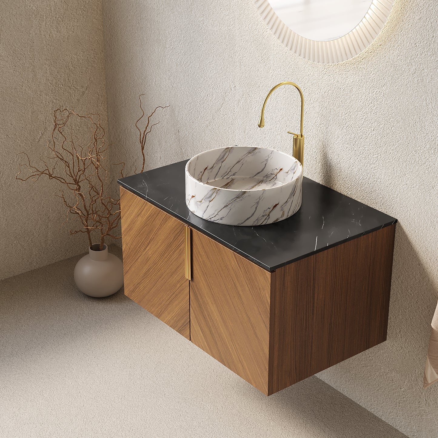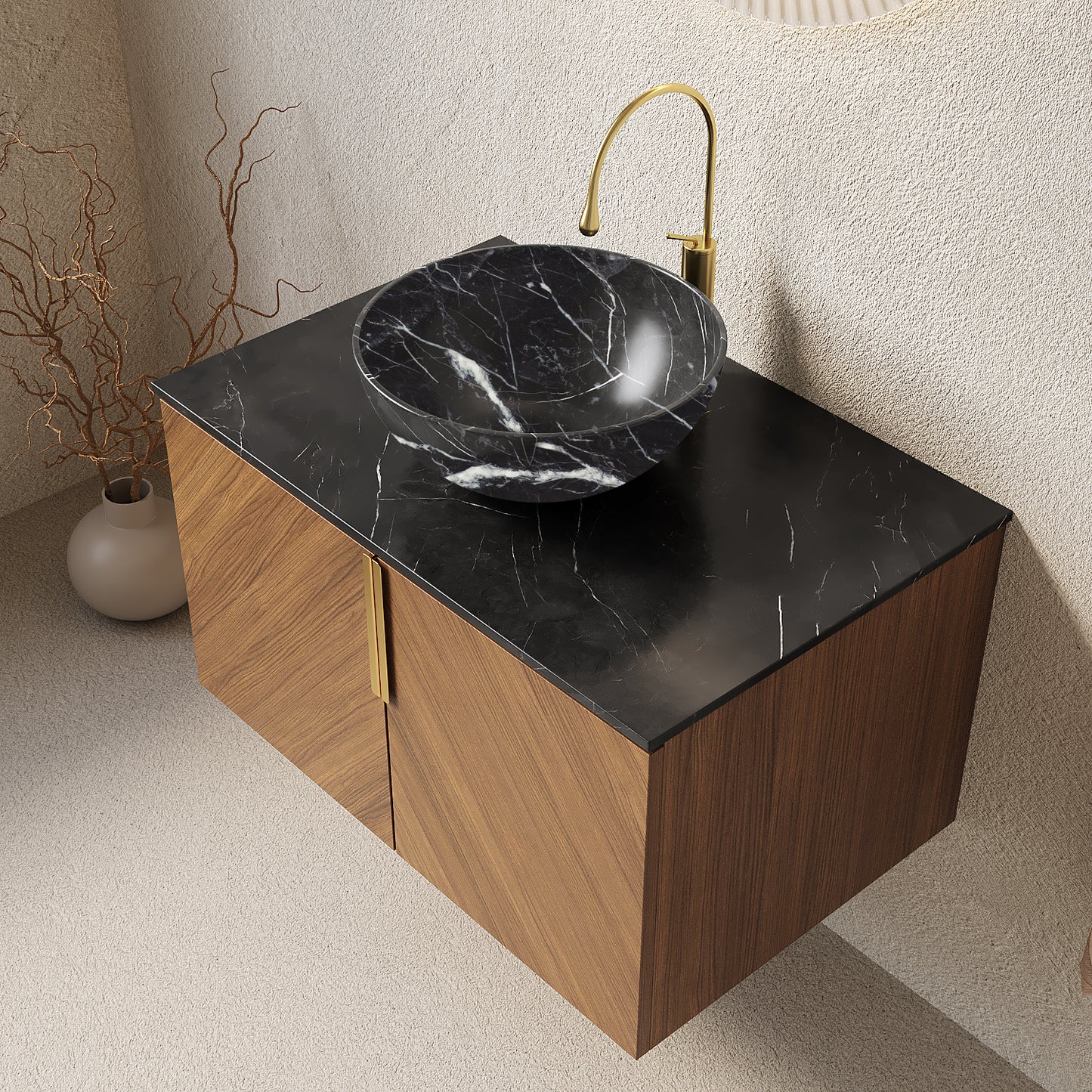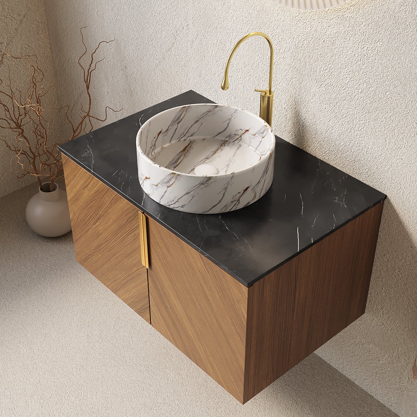 Arai 30" Bathroom Vanity With Sink, Modern Wall-mounted Floating Plywood Bathroom Storage Cabinet With Double Doors, Black Sintered Stone Countertop And Black Bowl Ceramic Basin, Espresso Color