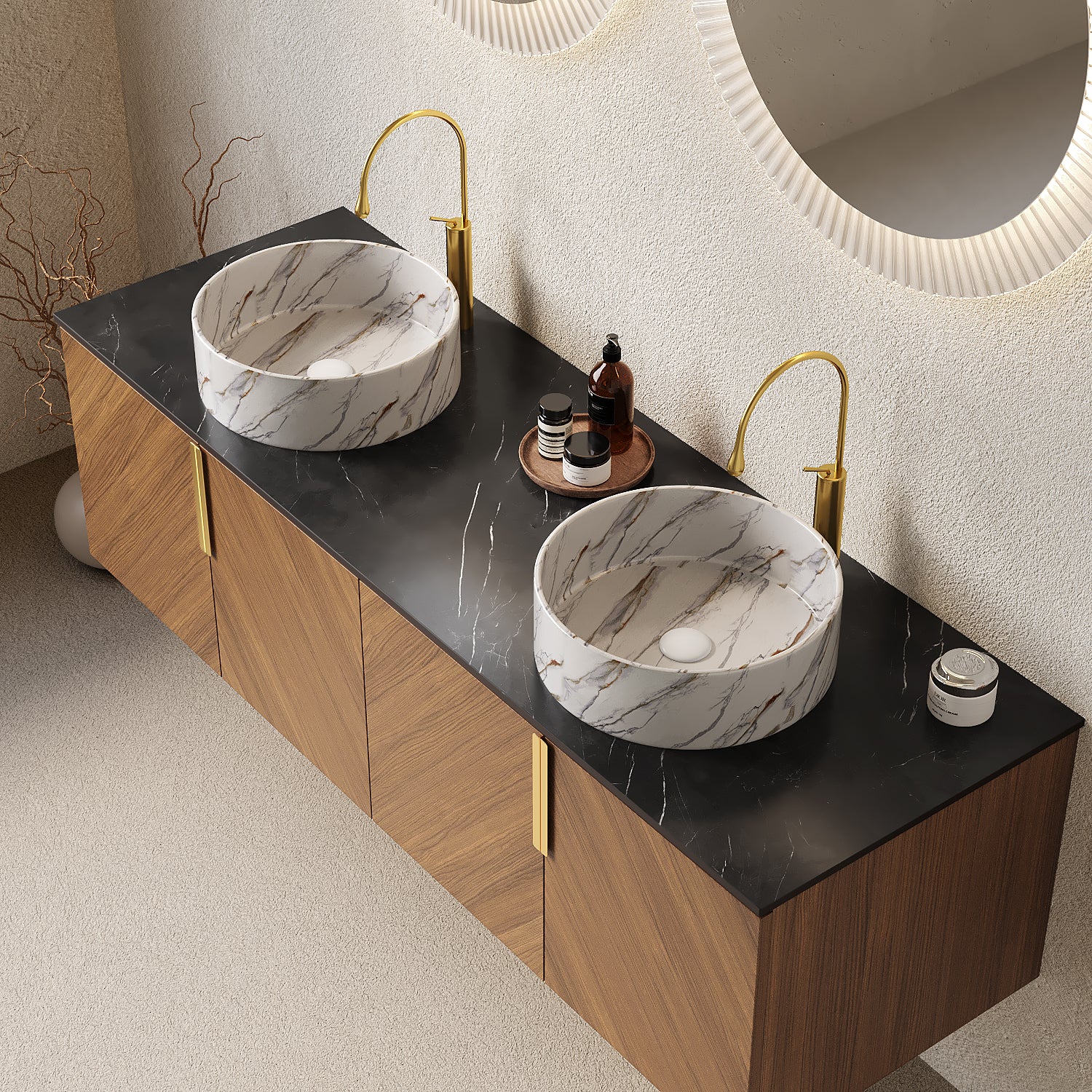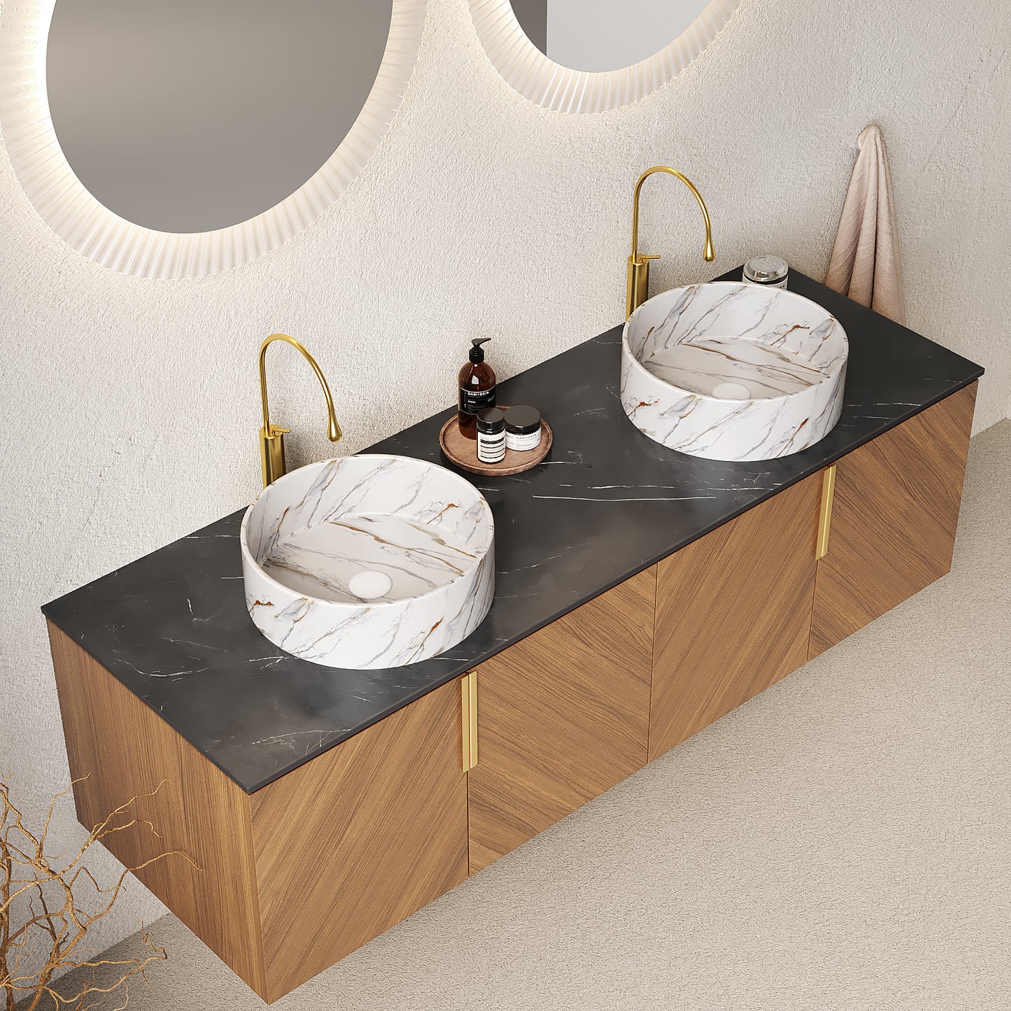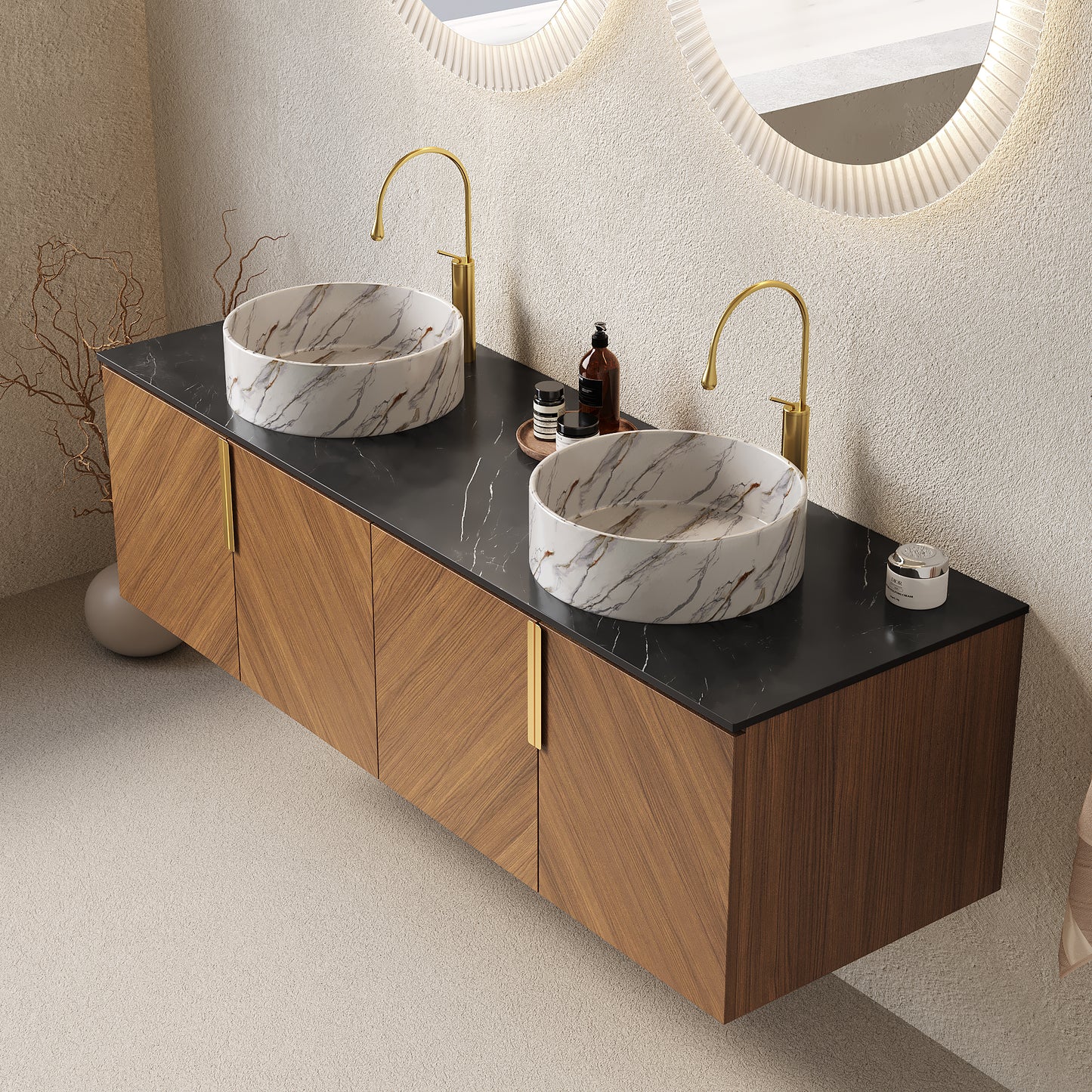 ARAI 60" Big Size Bathroom Vanity with Vessel Sink, Modern Wall-Mounted Floating Plywood Bathroom Storage Cabinet with 4 Doors, Shakespeare Black Sintered Stone Countertop and 2 White Round Ceramic Basins, Espresso Color