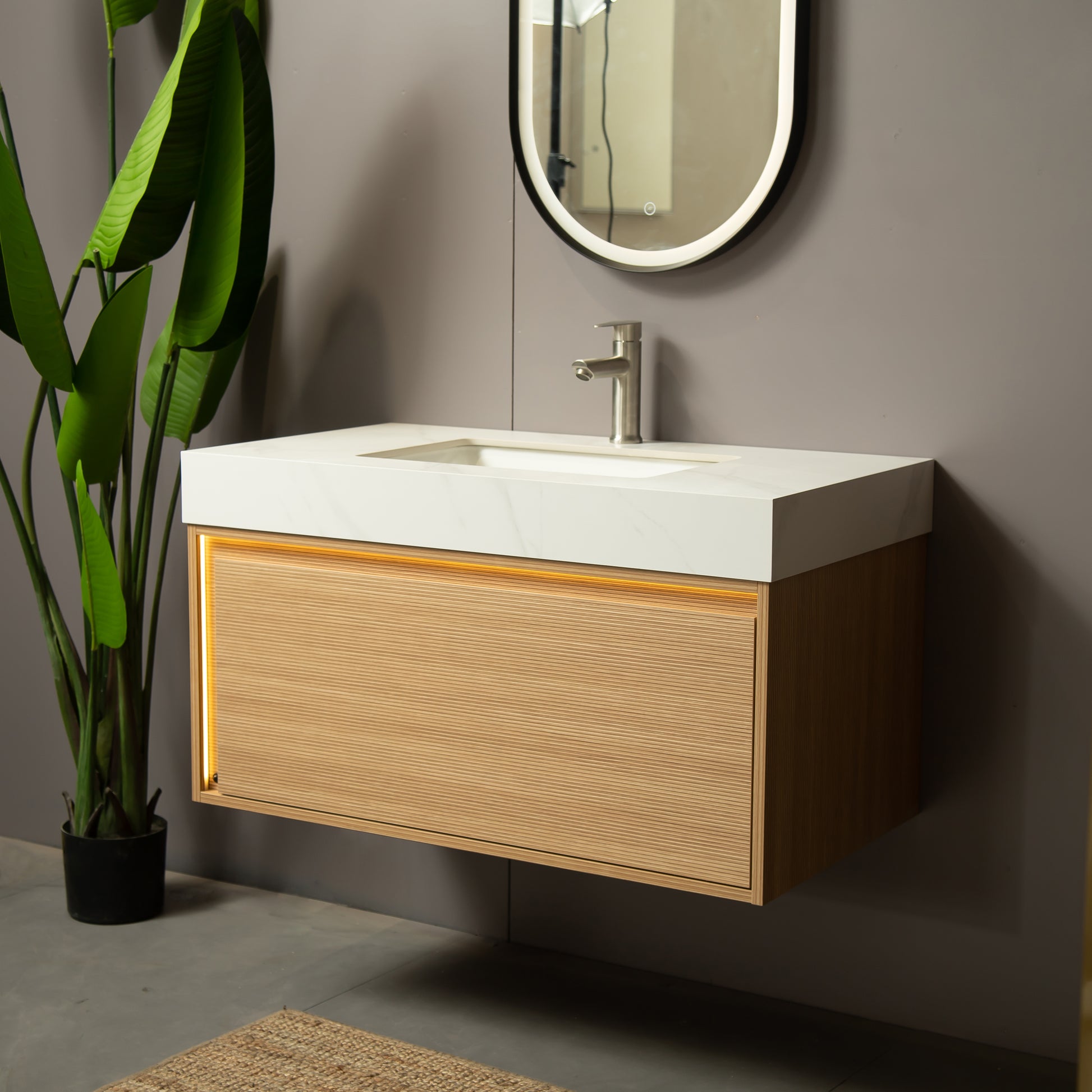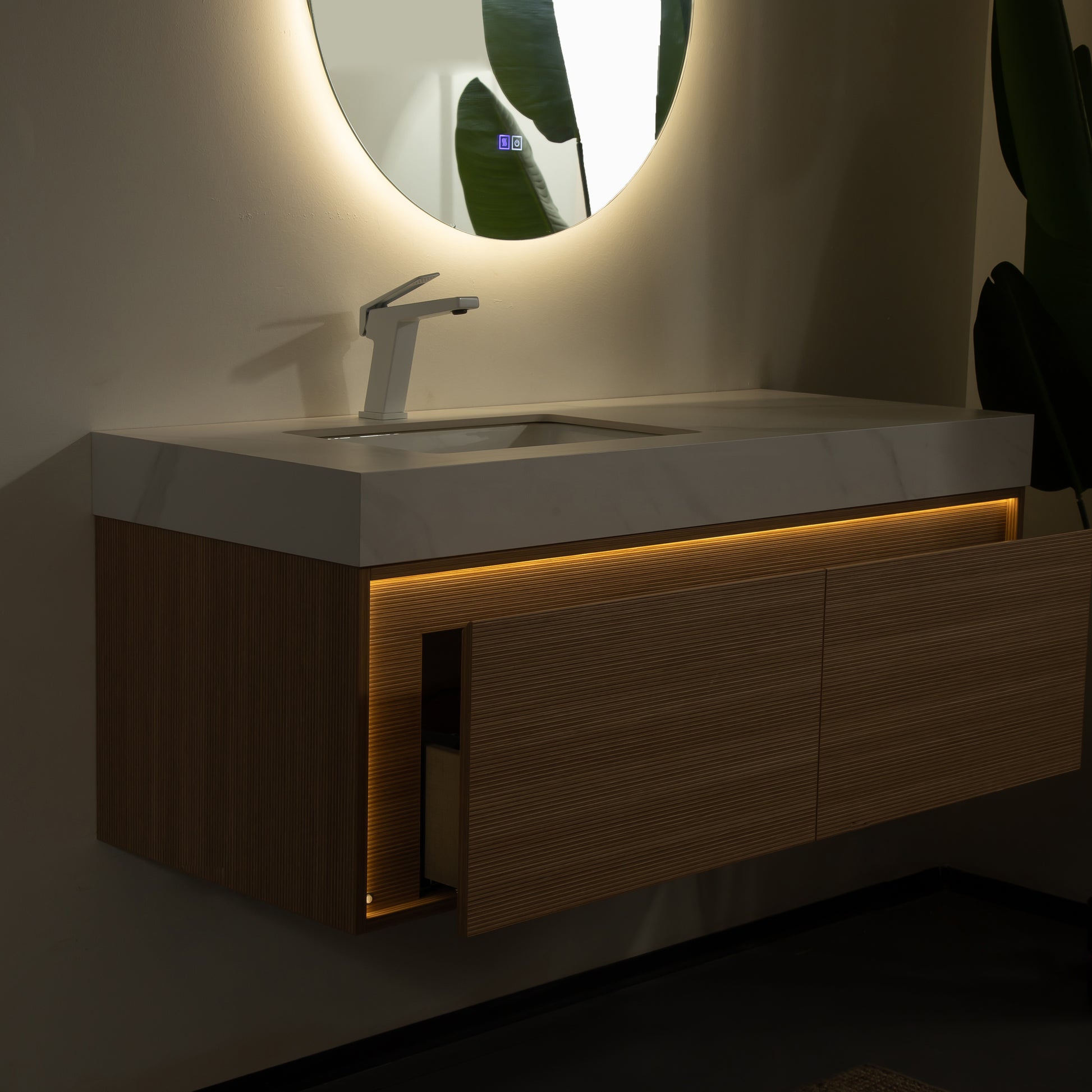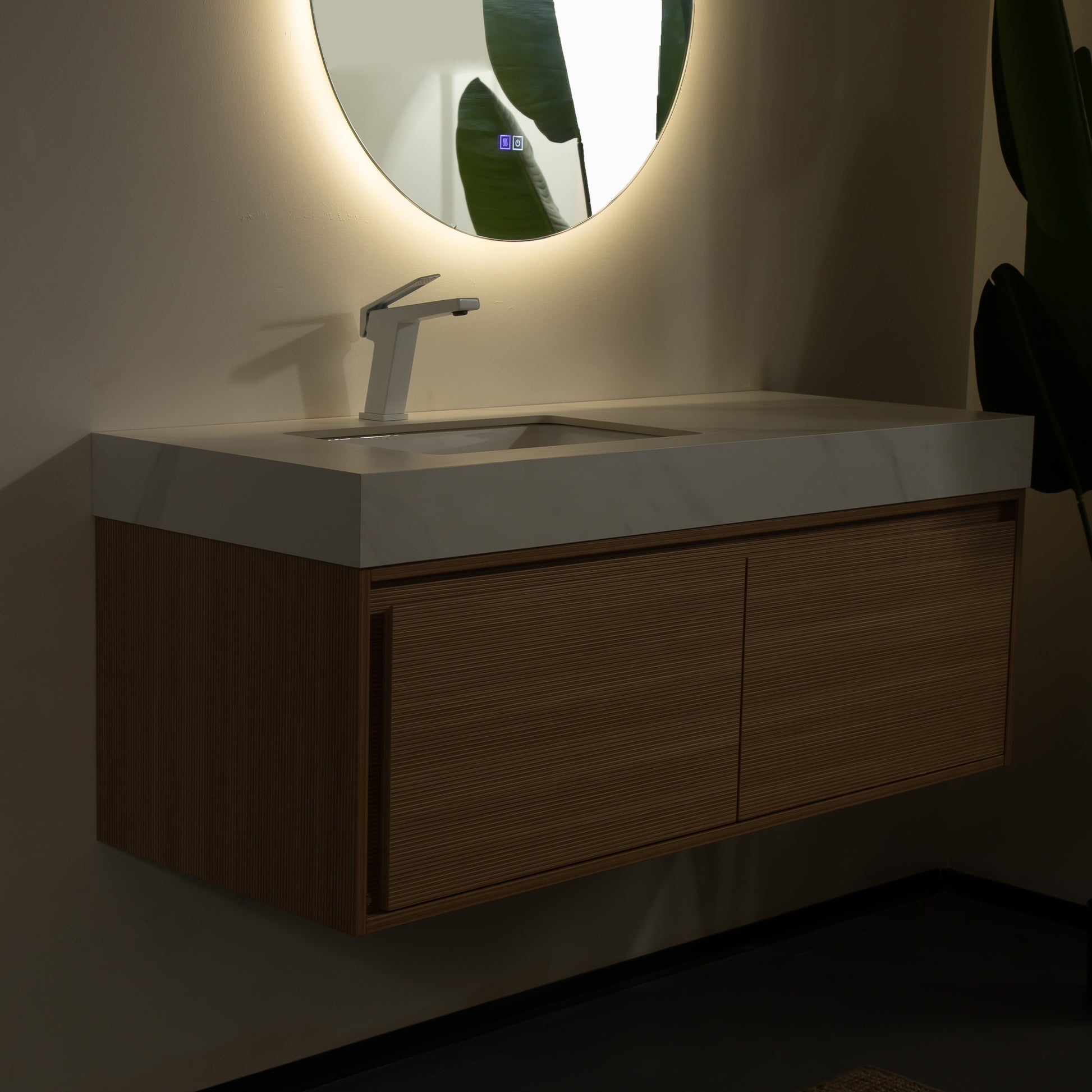 Sintered stone countertop with an inlaid under-mount ceramic basin for effortless daily upkeep. Its natural marble-like appearance infuses the bathroom with a subtle touch of luxury.