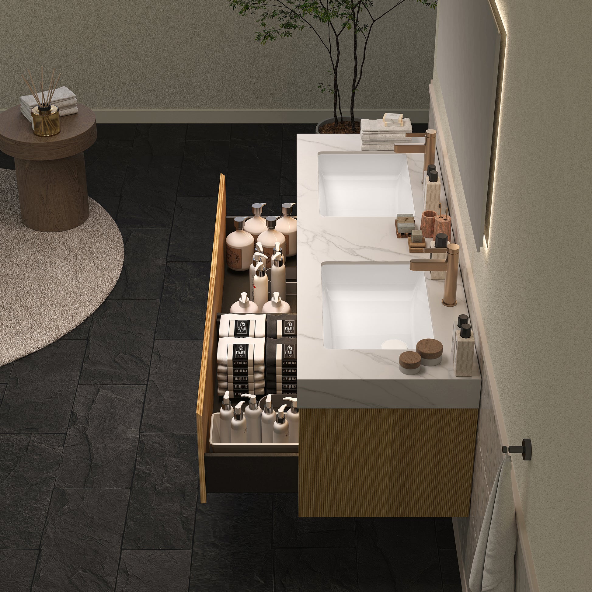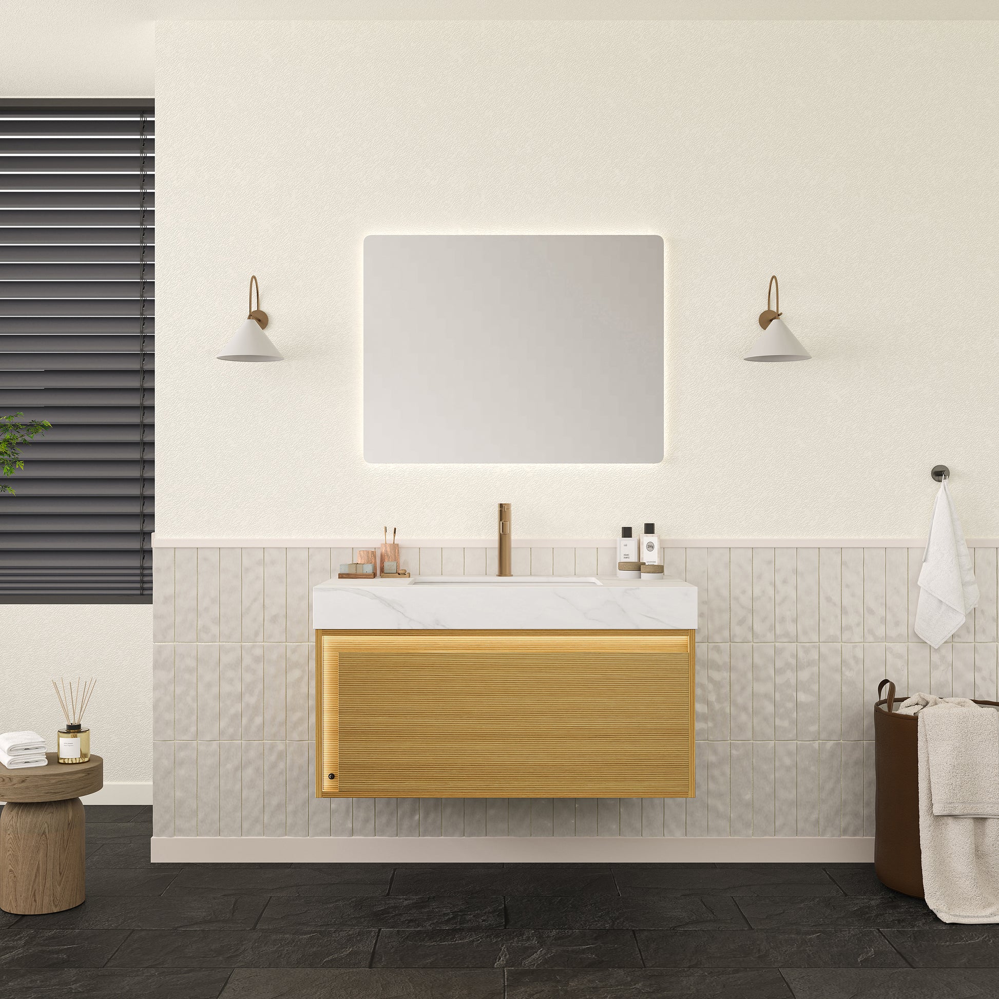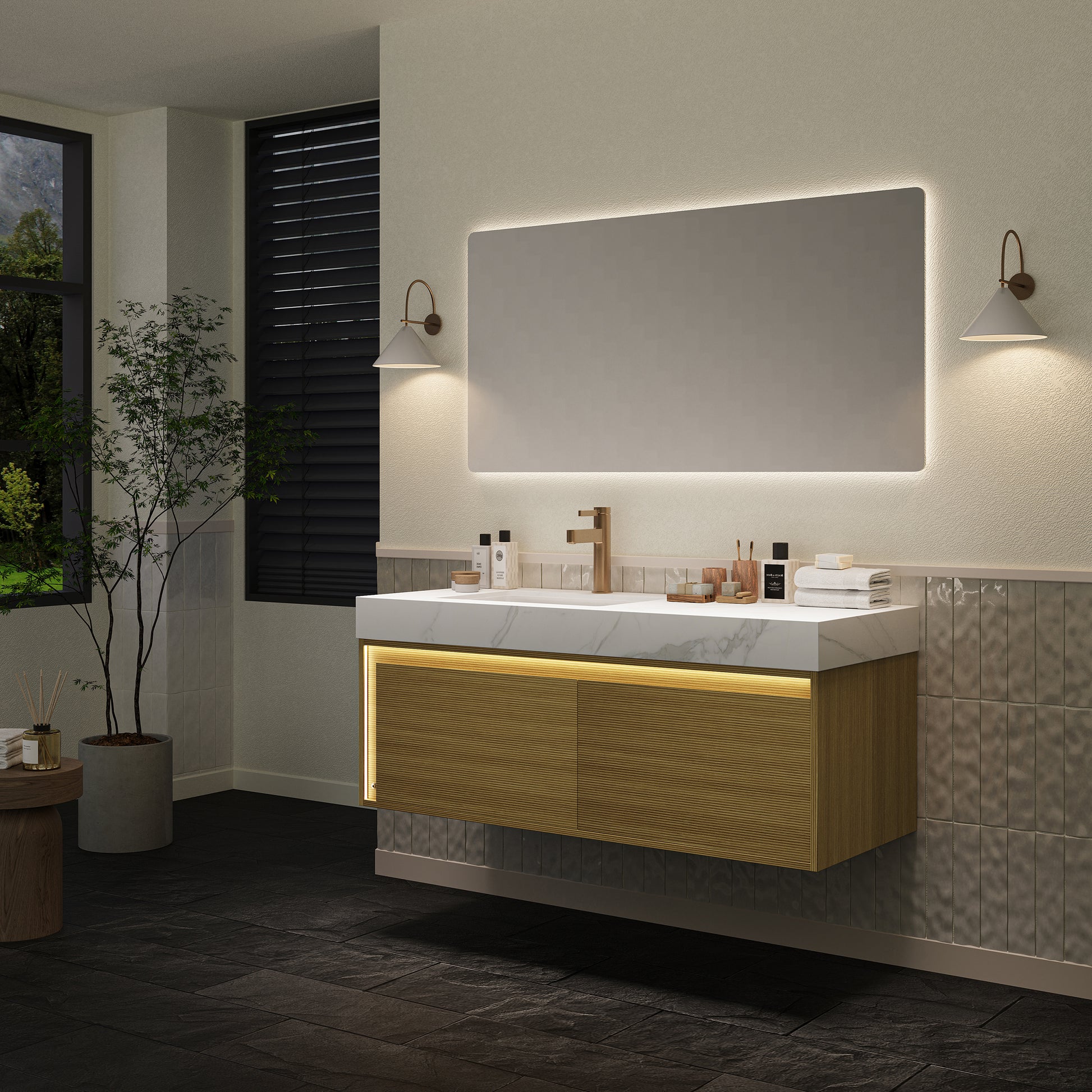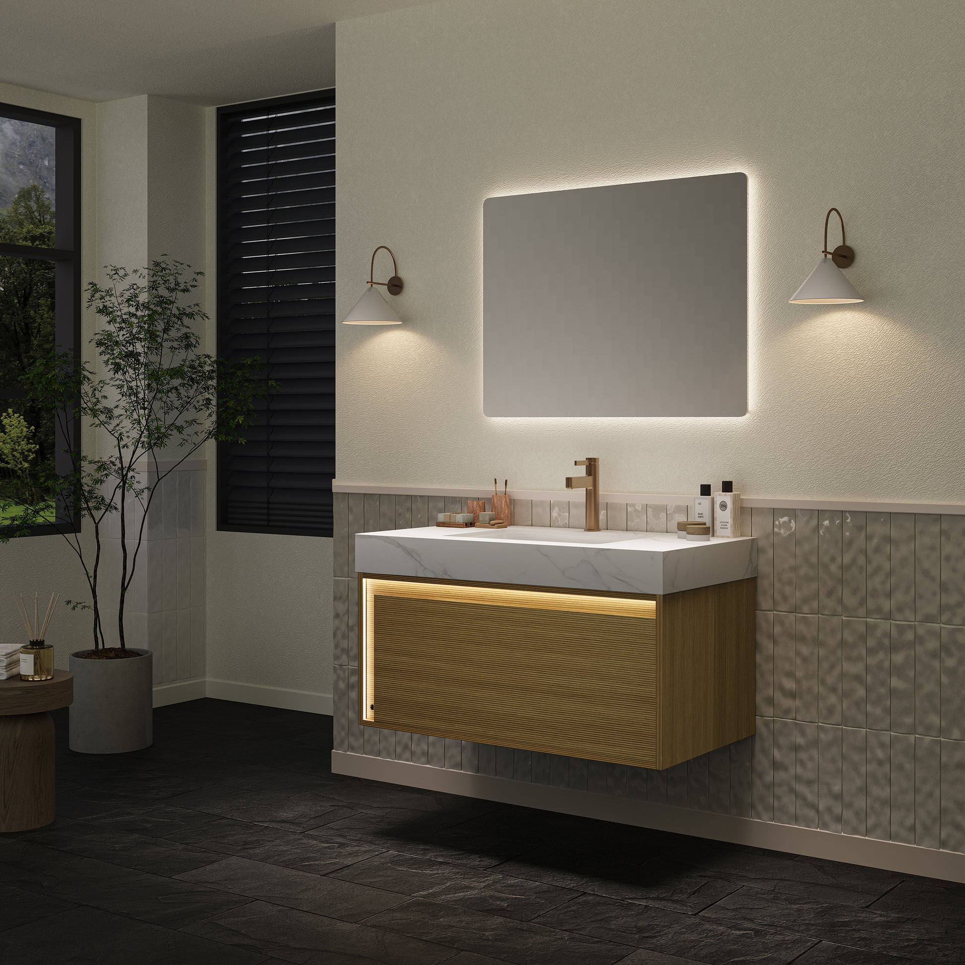 Sintered stone countertop with an inlaid under-mount ceramic basin for effortless daily upkeep. Its natural marble-like appearance infuses the bathroom with a subtle touch of luxury.