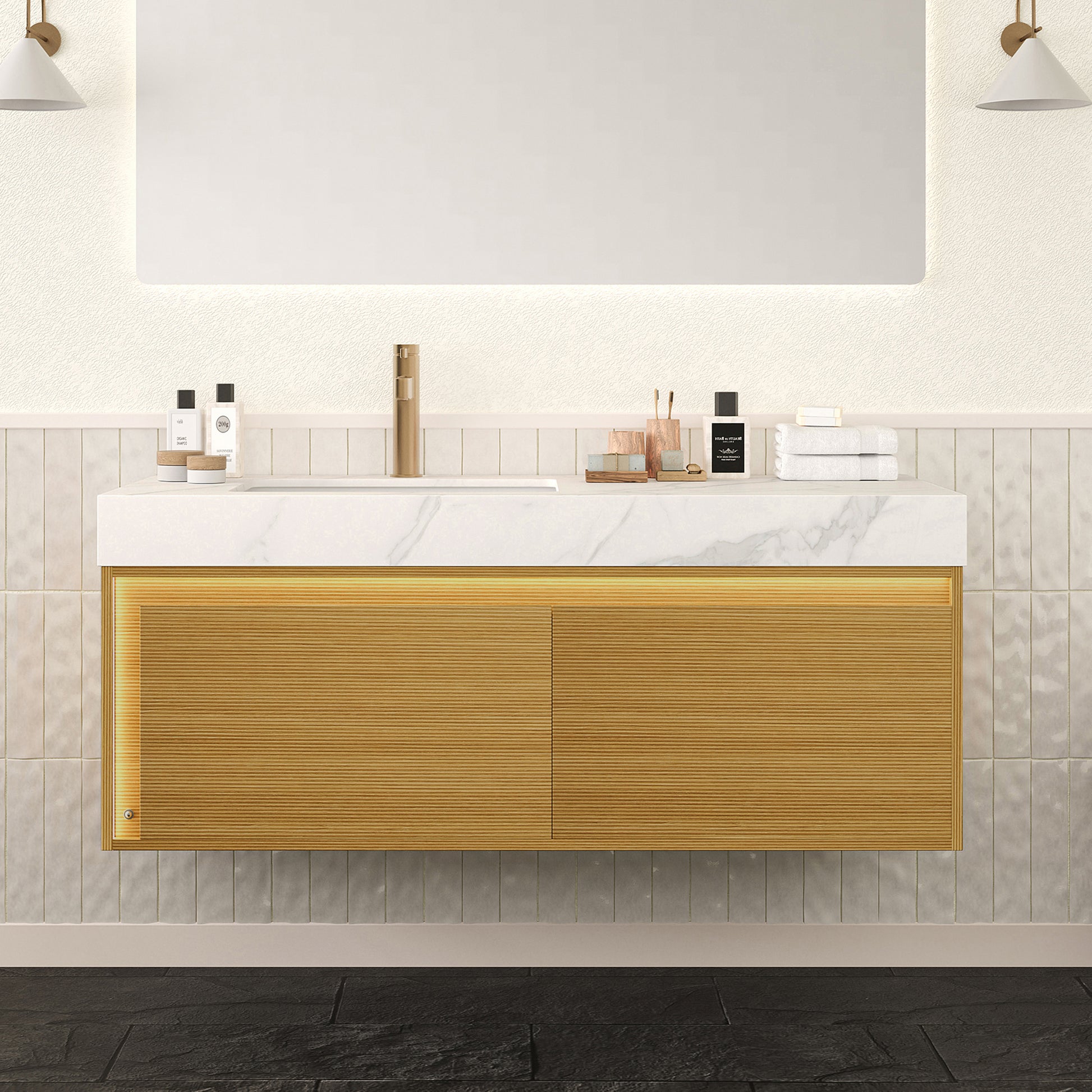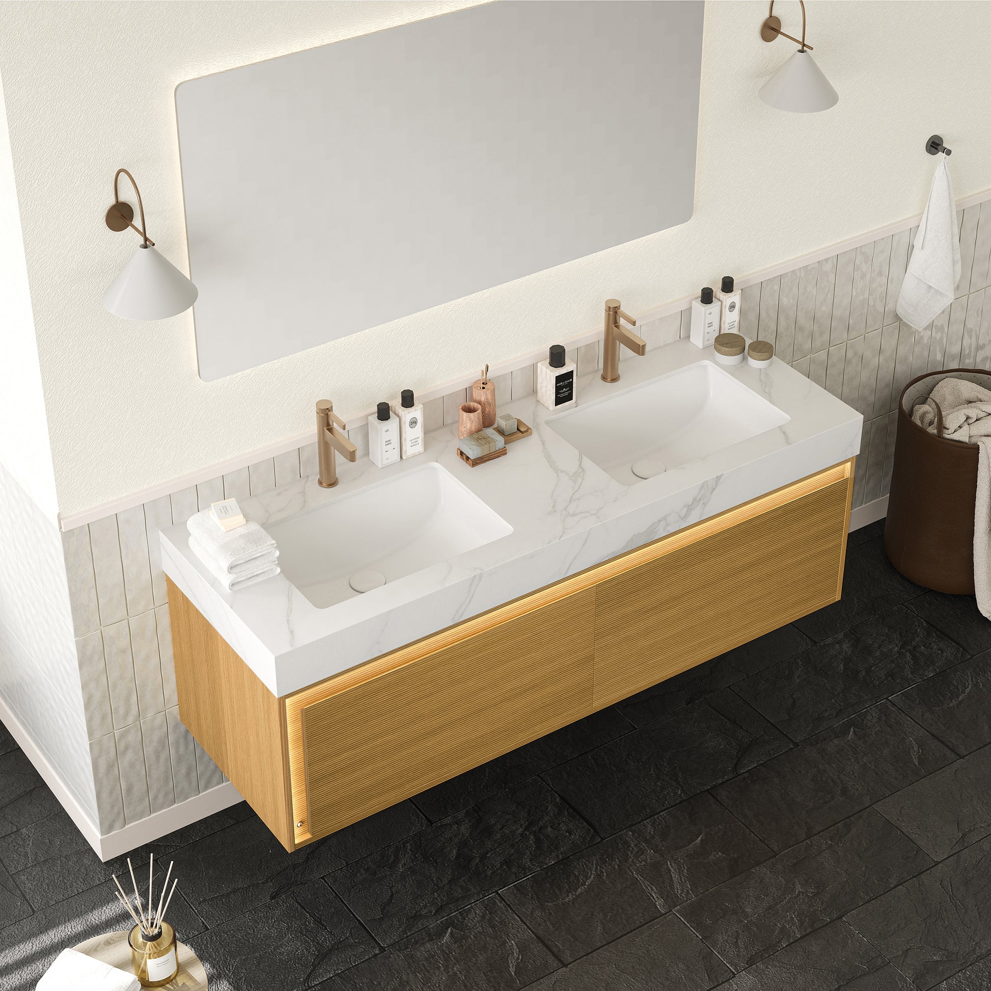 NYAH 60'' Bathroom Vanity&Sinks, Floating Ultra-Slim Grille Plywood Storage Cabinet, Carrara White