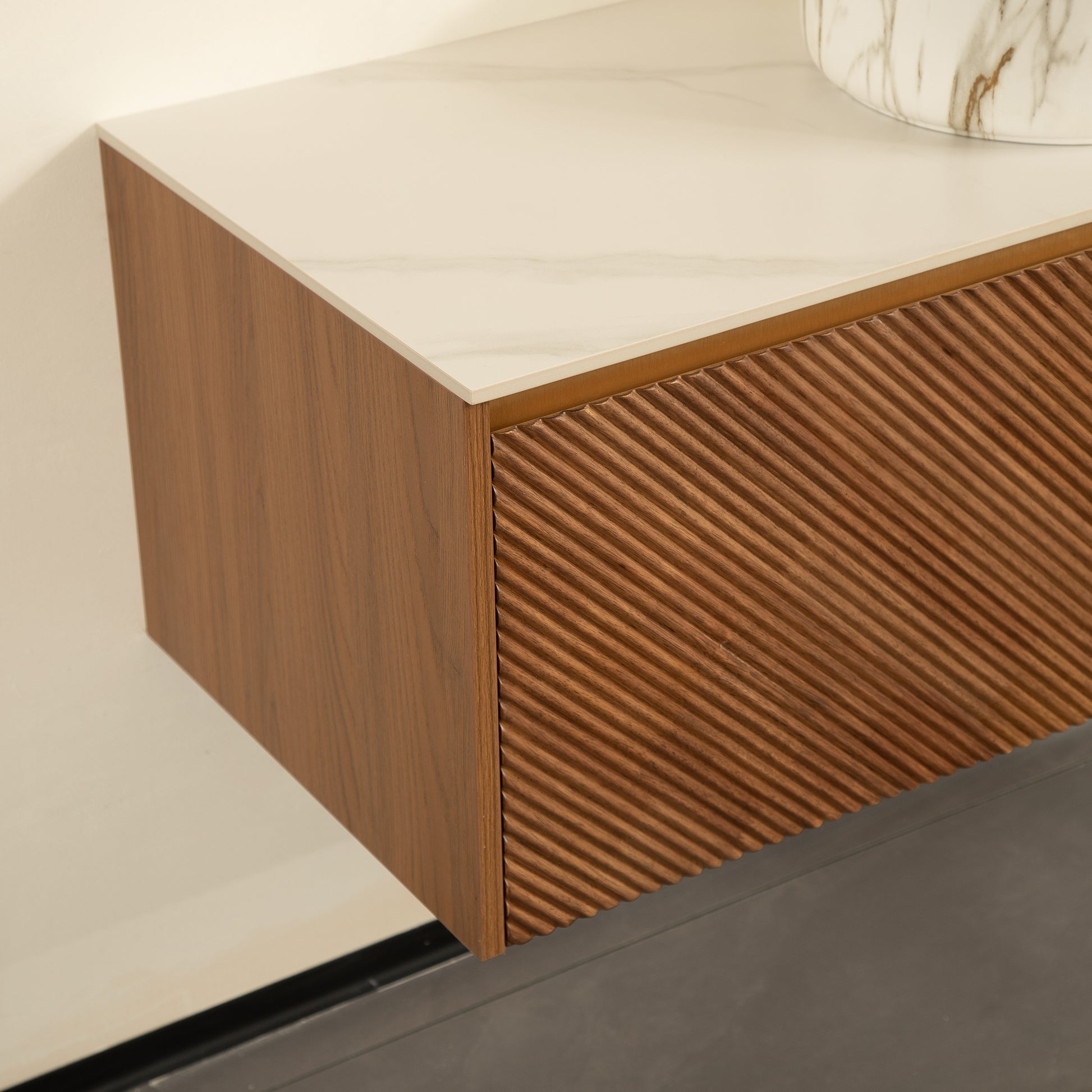 The drawer panel is made of solid wood board with a thickness of 18mm. Create a simple, natural and harmonious atmosphere to bathroom space. The groove drawing process presents a concave and convex texture on drawer surface, The groove drawing process creates a concave-convex texture on the drawer surface, and the use of solid wood brings vivid, full details.