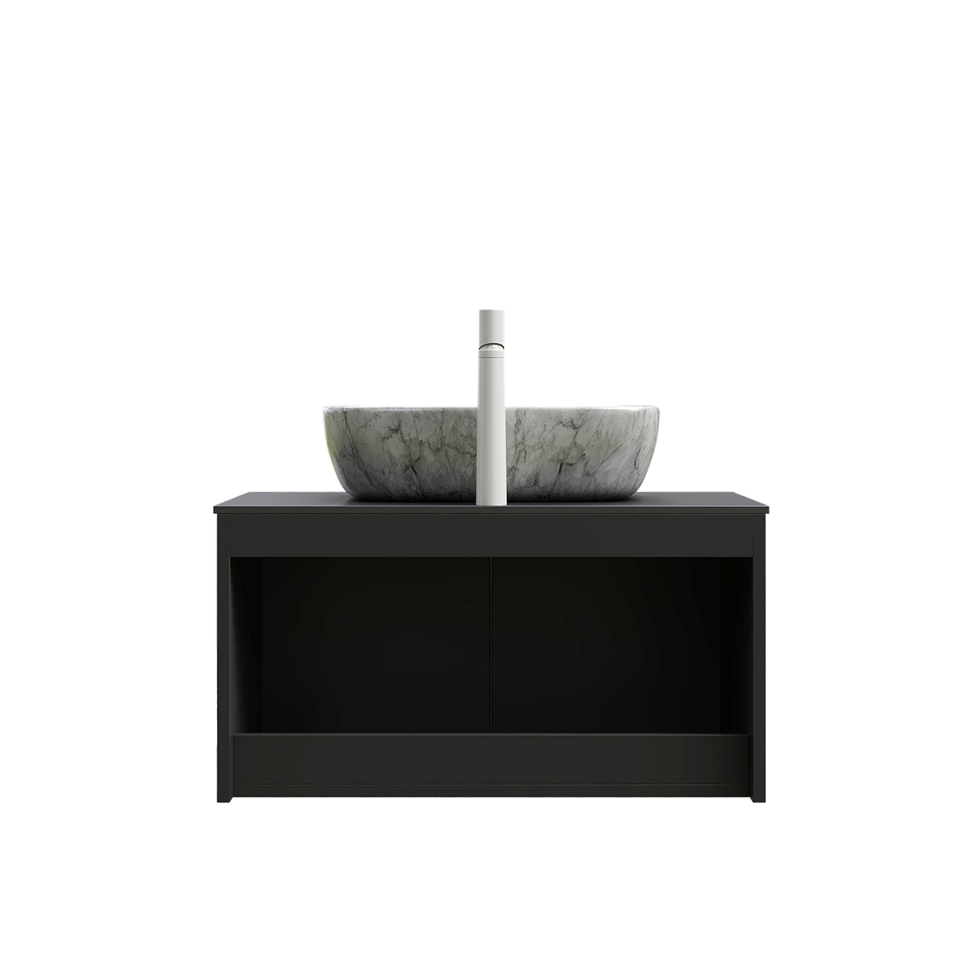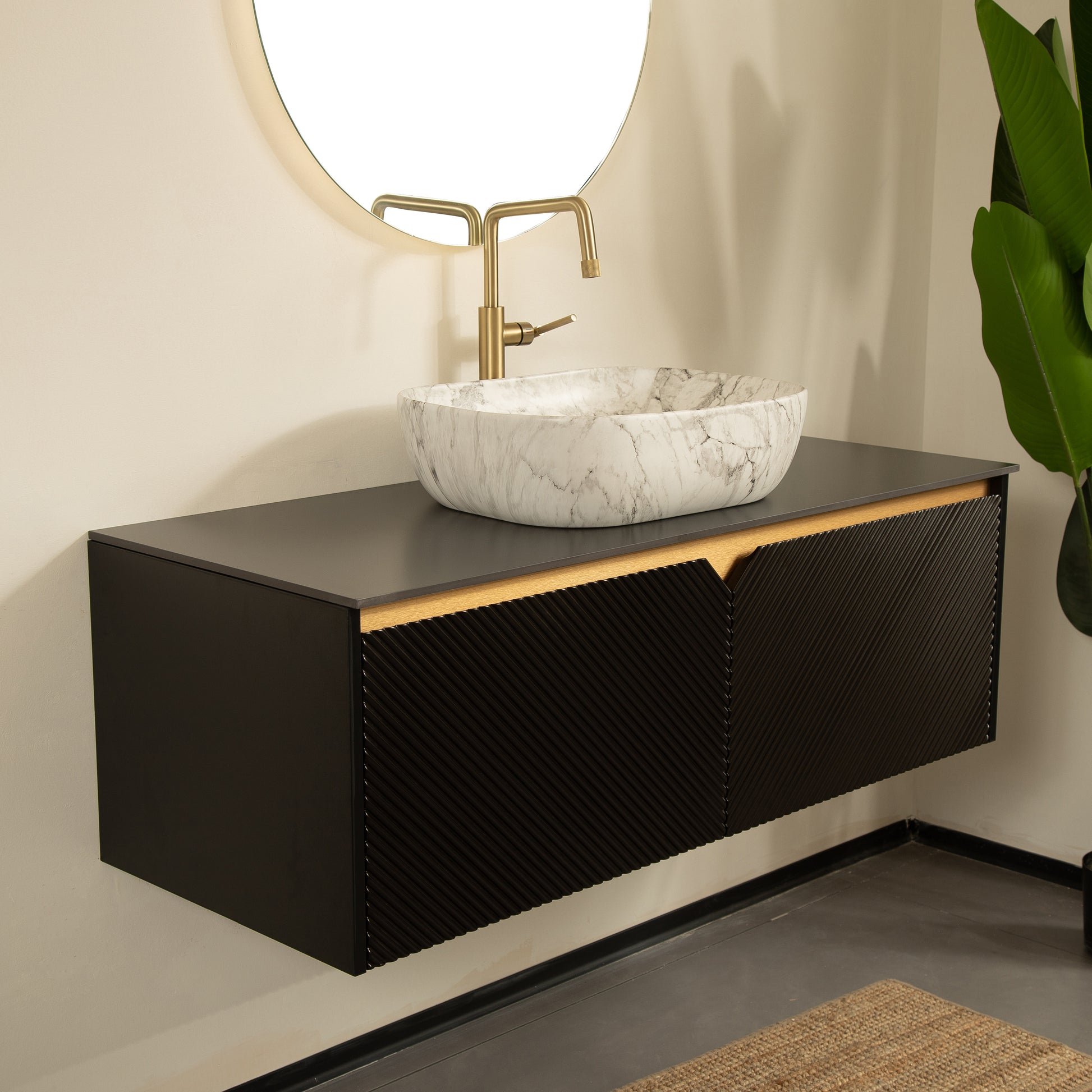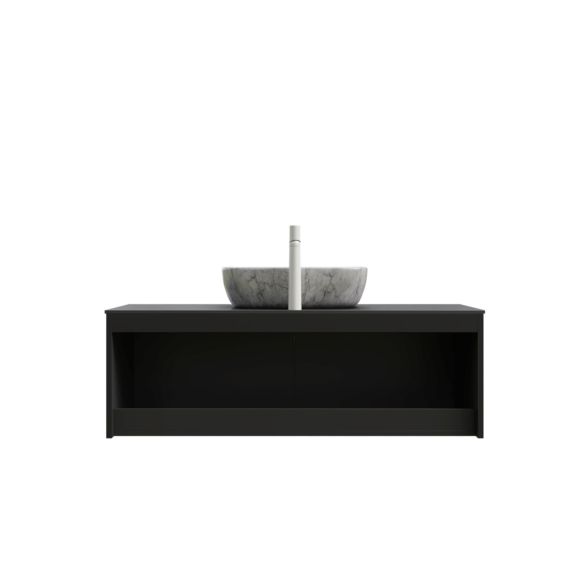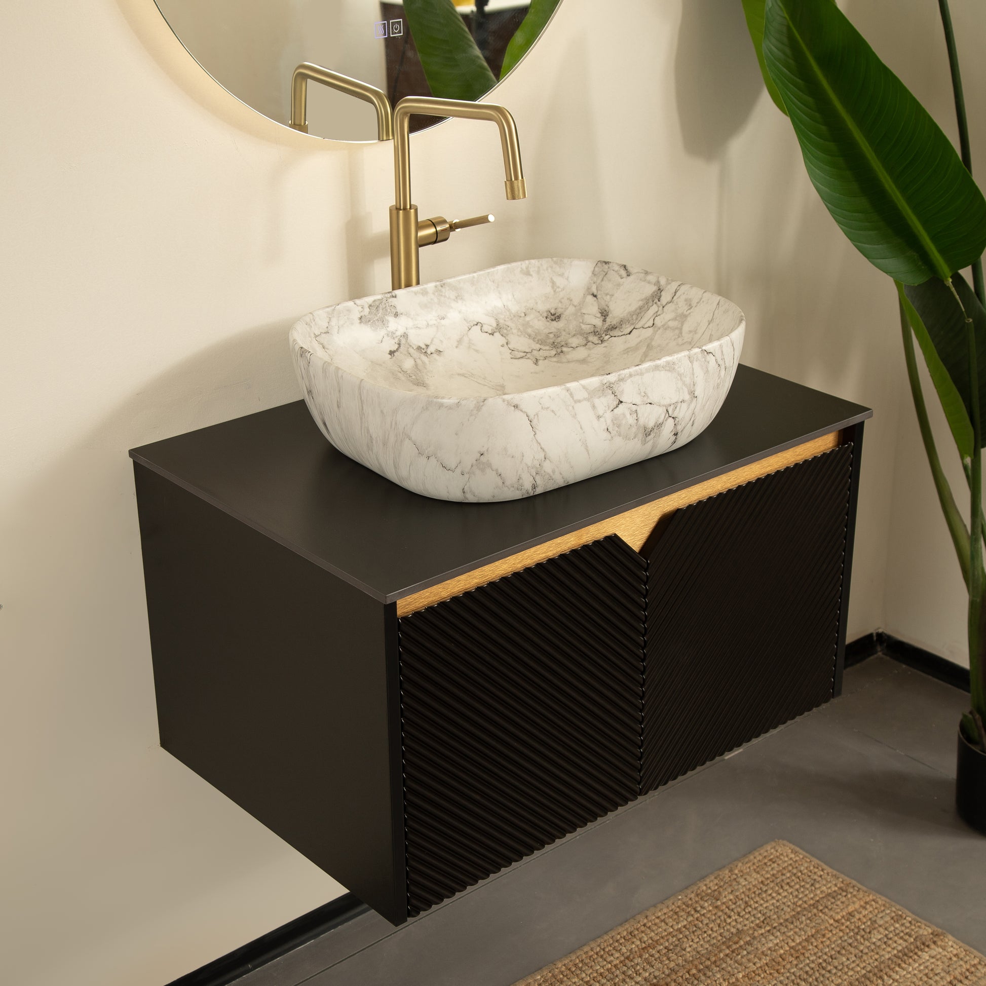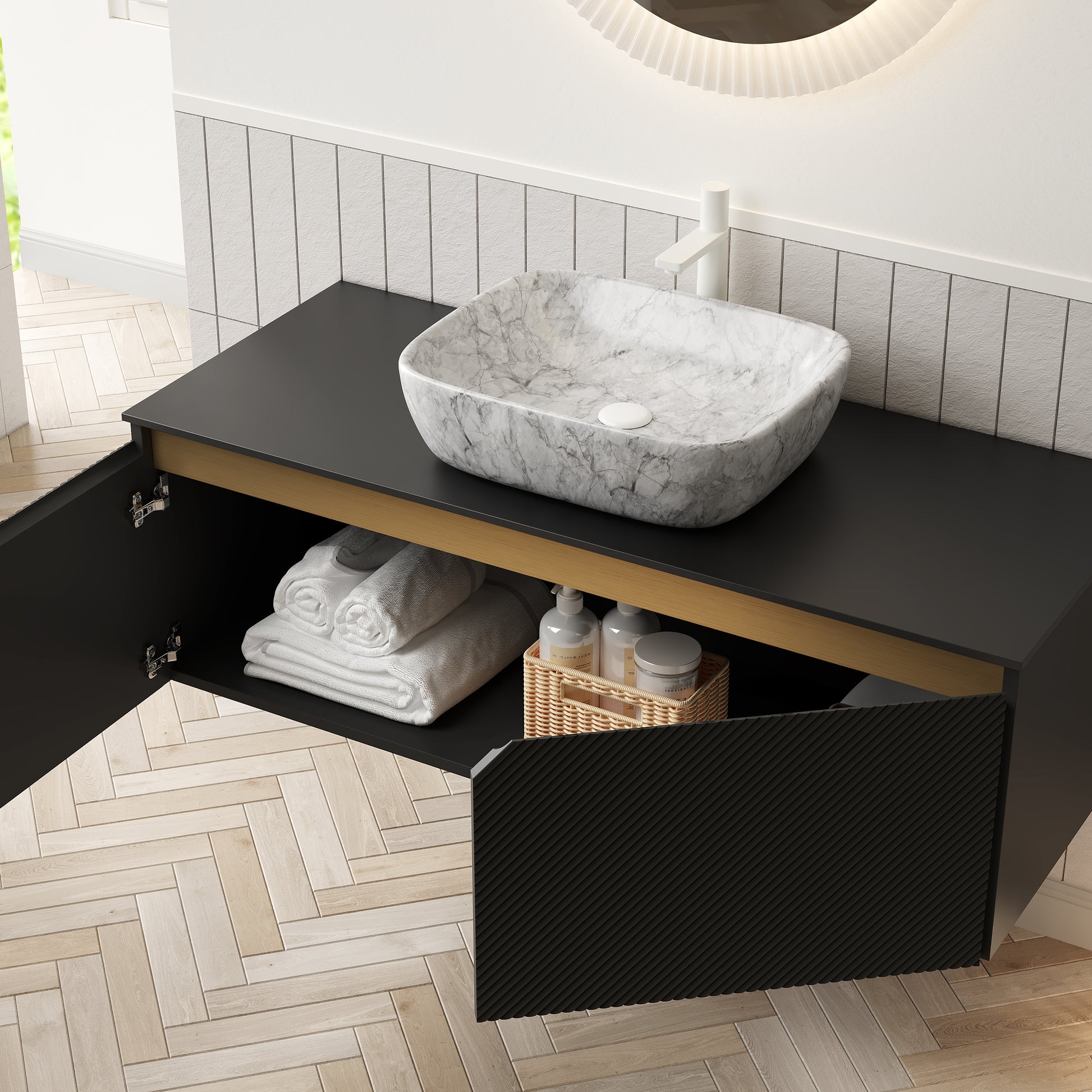 RUBEN 48" Bathroom Vanity&Sink, Wall-Mounted Floating Plywood Storage Cabinet,Black,Marble Pattern Rectangle Ceramic Vessel Basin