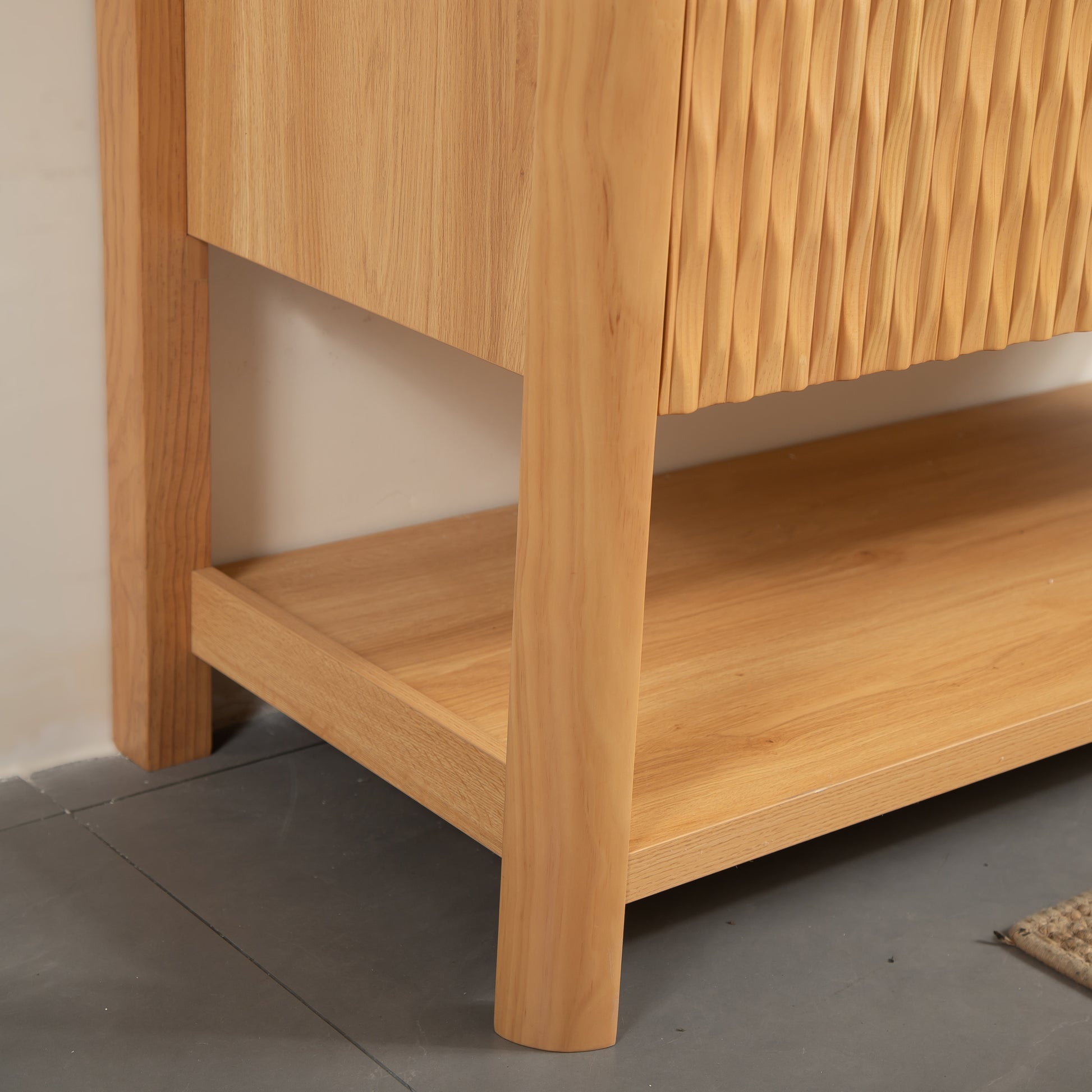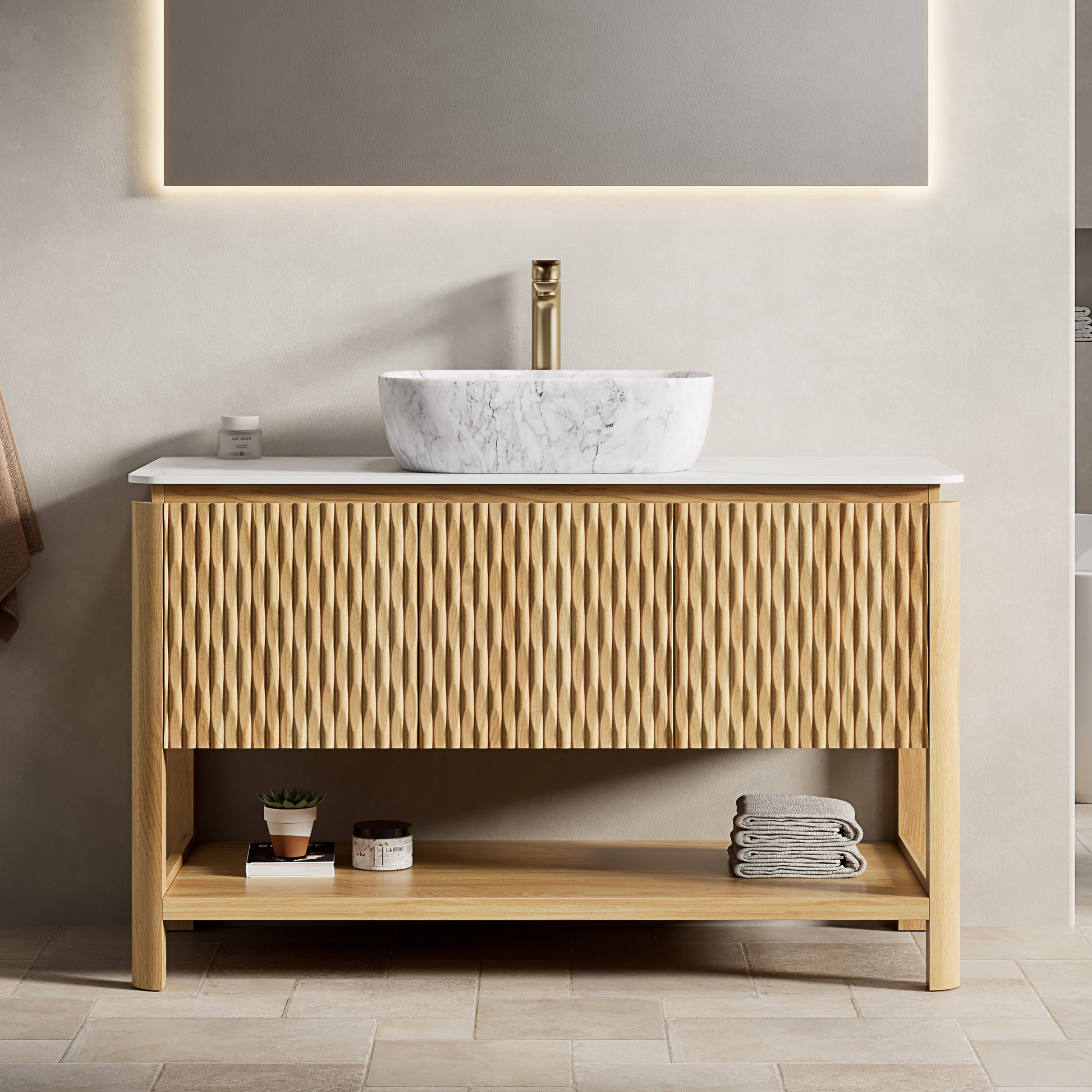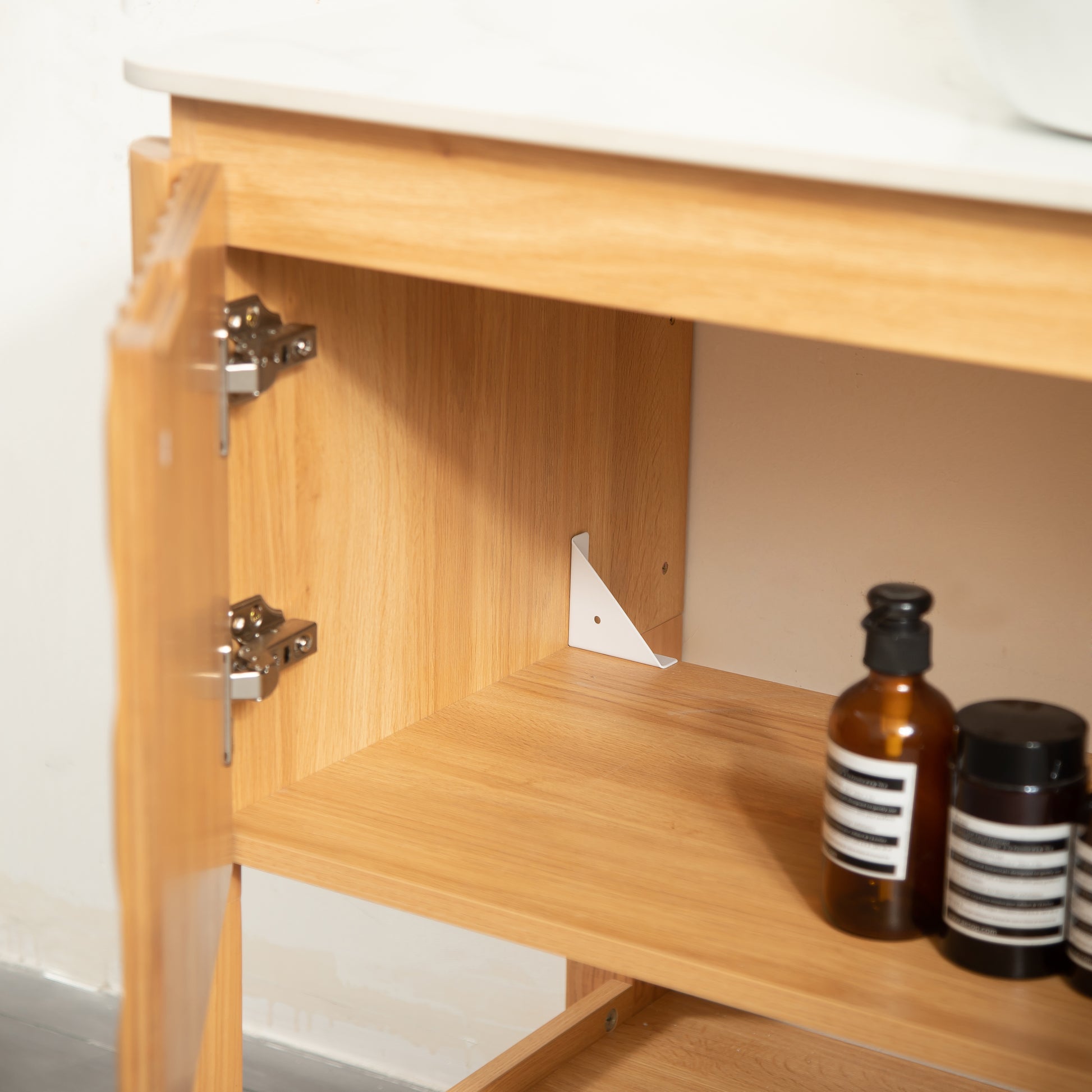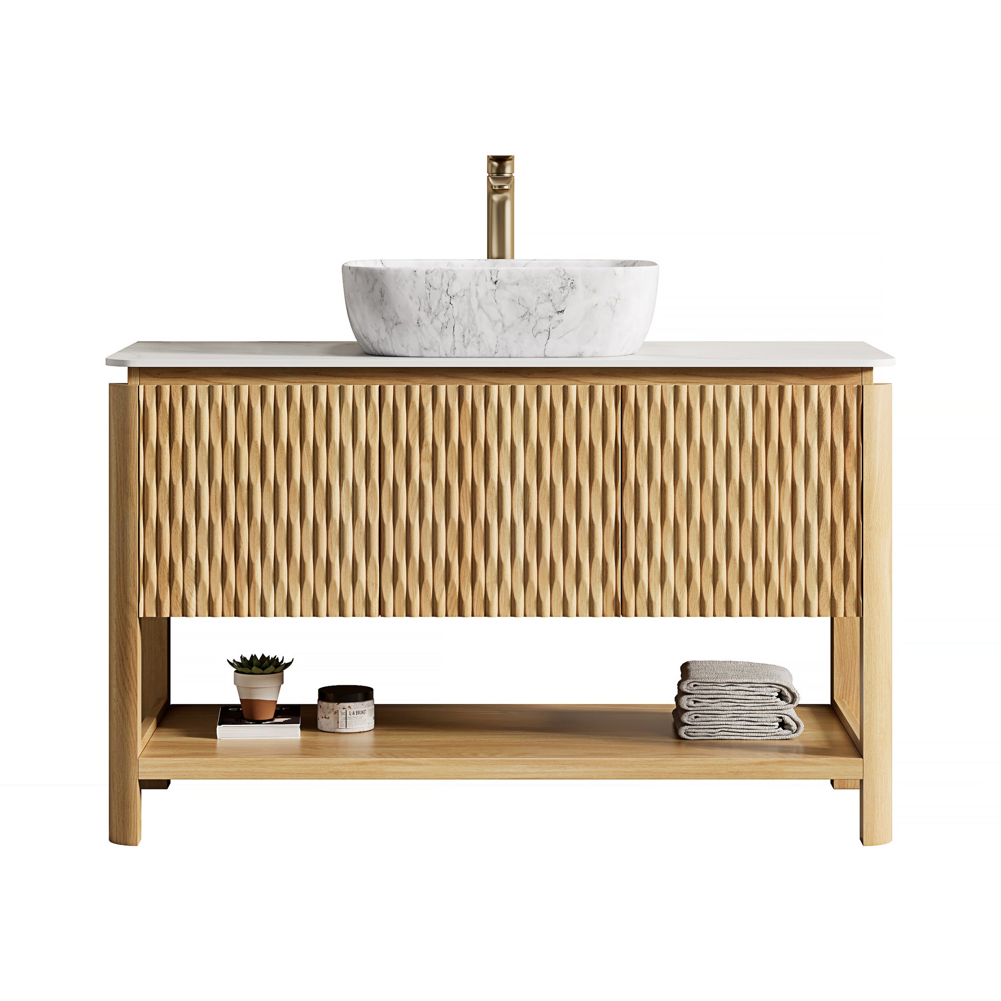 SHARMA 60" Bathroom Vanity&Sinks, Freestanding Plywood Storage Cabinet with 4 Bamboo Texture Doors&Open Shelf, 2 Marble Pattern Ceramic Basins&Carrara White Sintered Stone Top, Woodgrain Color