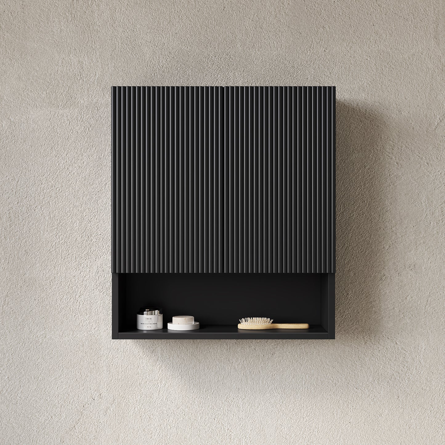 - Plenty of Storage Space and Soft Close Damper This wall-mounted storage cabinet has two doors. Grooves at the lower ends of the doors can makes it open and close ease. Inside, there is a shelf that helps you to classify your items. Below the cabinet doors, there is also an open-style storage compartment, which can be used to place items such as tissues and towels. It is highly suitable for places like bathroom, laundry room, and kitchen. The door of this cabinet built-in soft close damper to ensure the doors close quietly and smoothly, dampens the banging the sound of any slamming of the doors, also prevent the finger pinching.