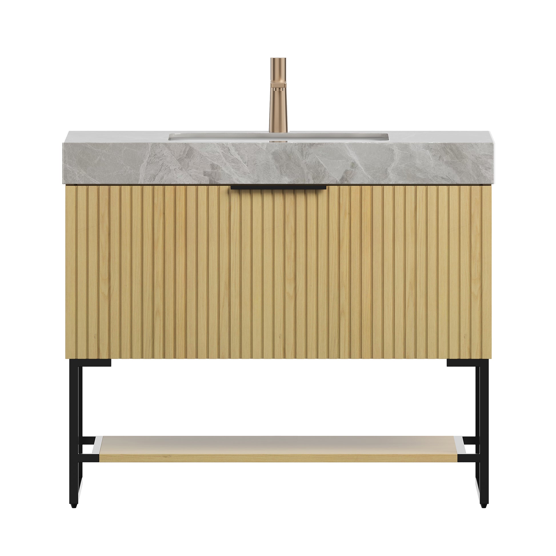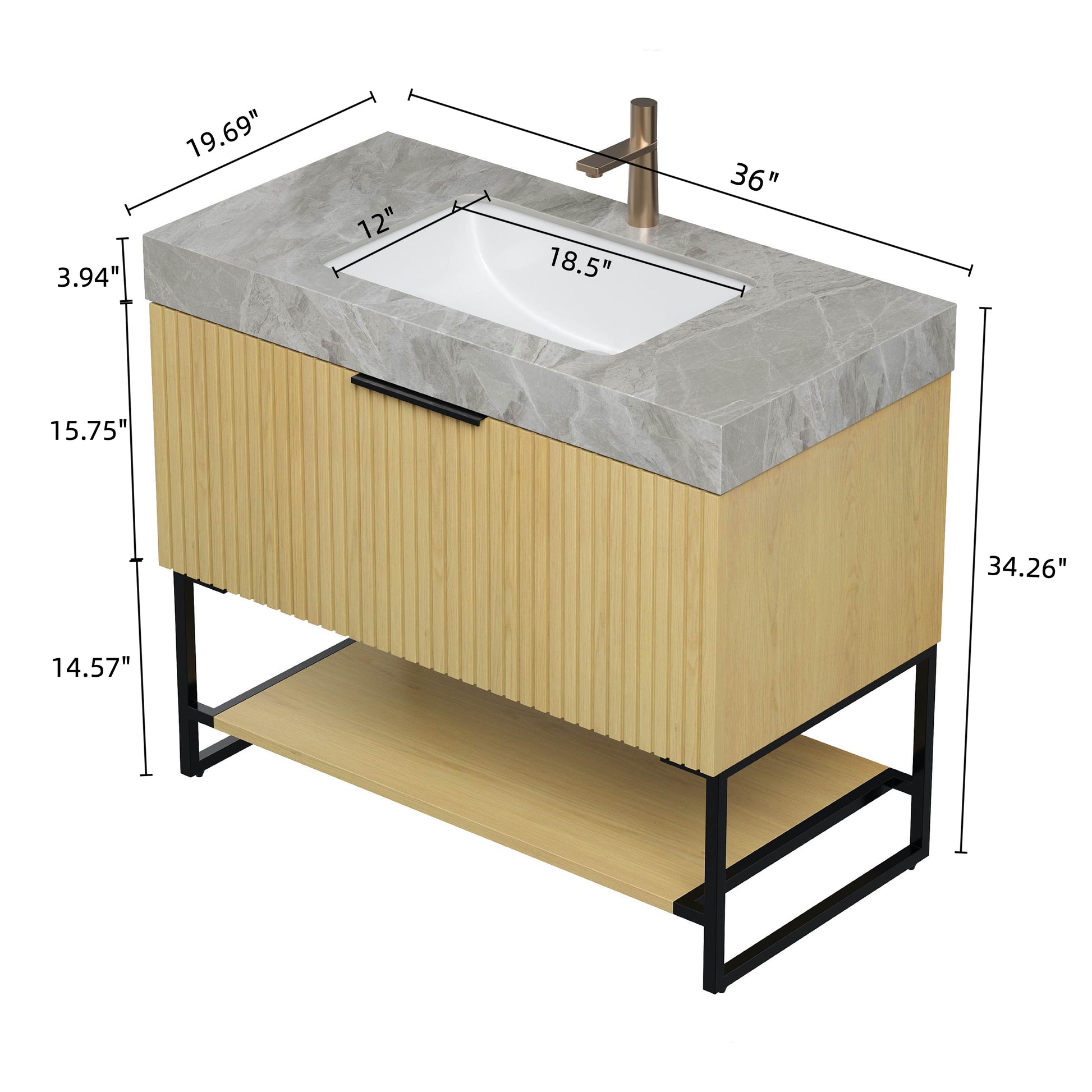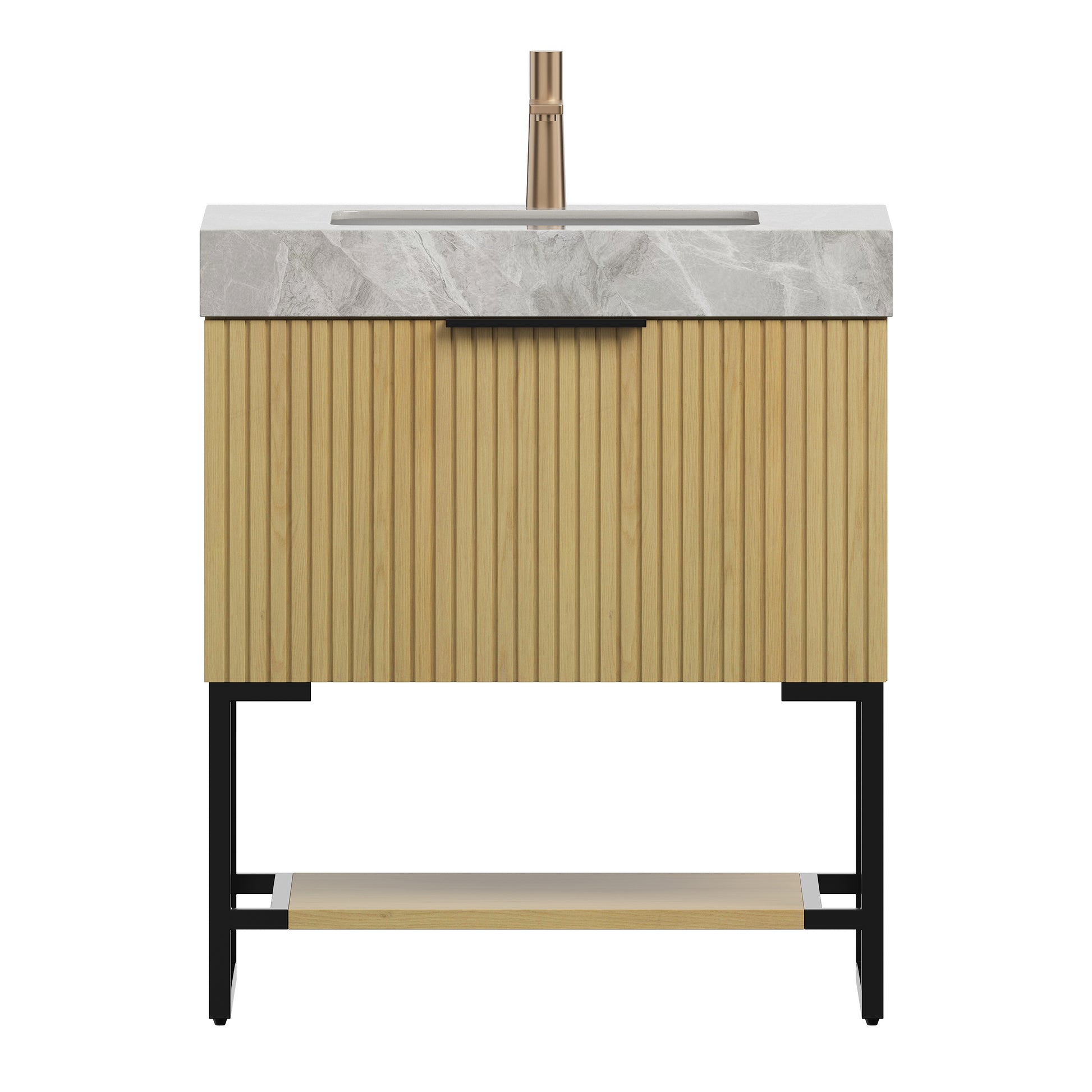 YOLAN 30" Bathroom Vanity&Sink, Freestanding Striped Plywood Storage Cabinet with Drawer&Open Shelf, Light Gray Sintered Stone Top&Undermount Ceramic Basin